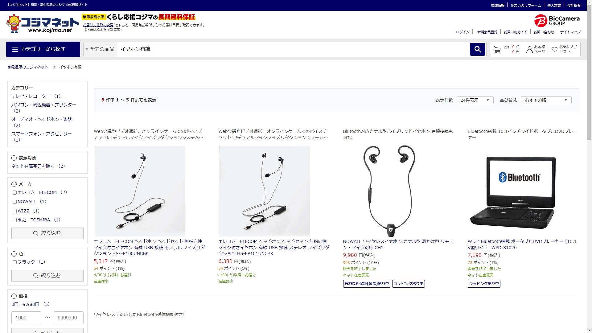 イヤホン有線は家電・電化製品のコジマに売っています