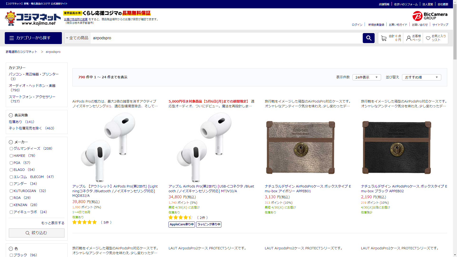 お調べしたところ現在、家電・電化製品のコジマではairpodsproの関連する商品が販売されています。