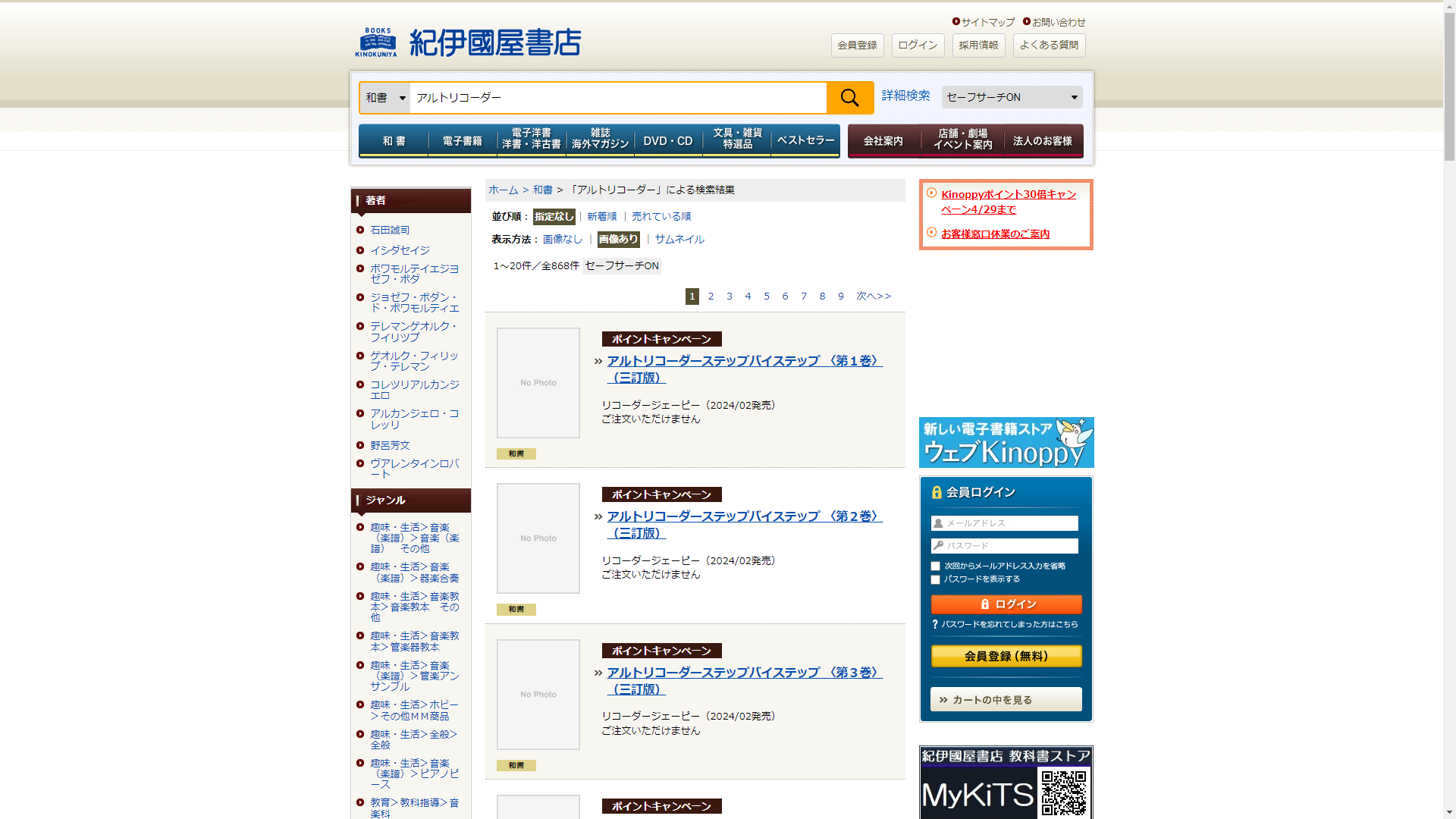 お調べしたところ現在、紀伊國屋書店ではアルトリコーダーに関連する商品を買うことが可能です。