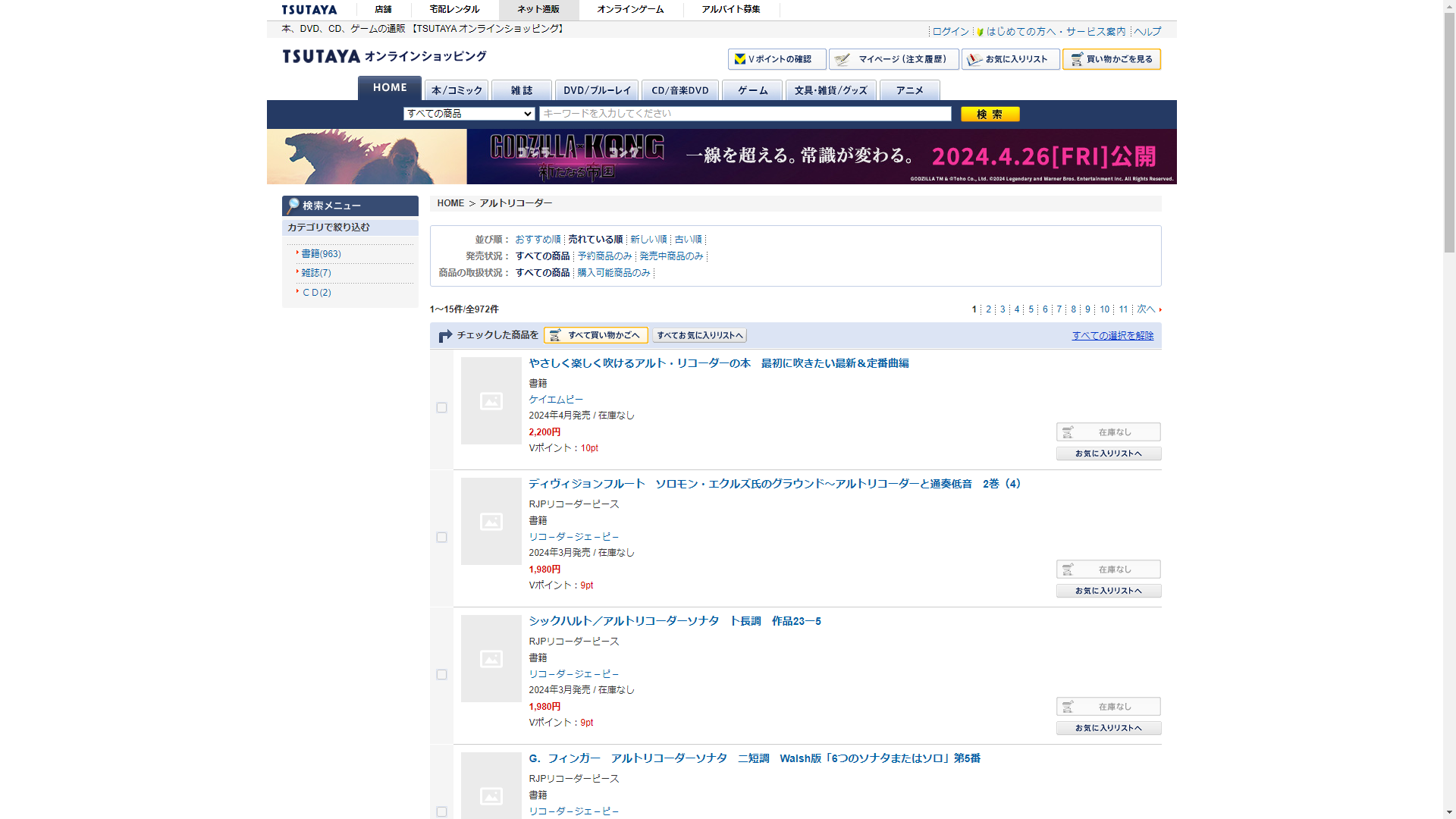 お調べしたところ現在、蔦屋書店ではアルトリコーダーの関連する商品が販売されています。