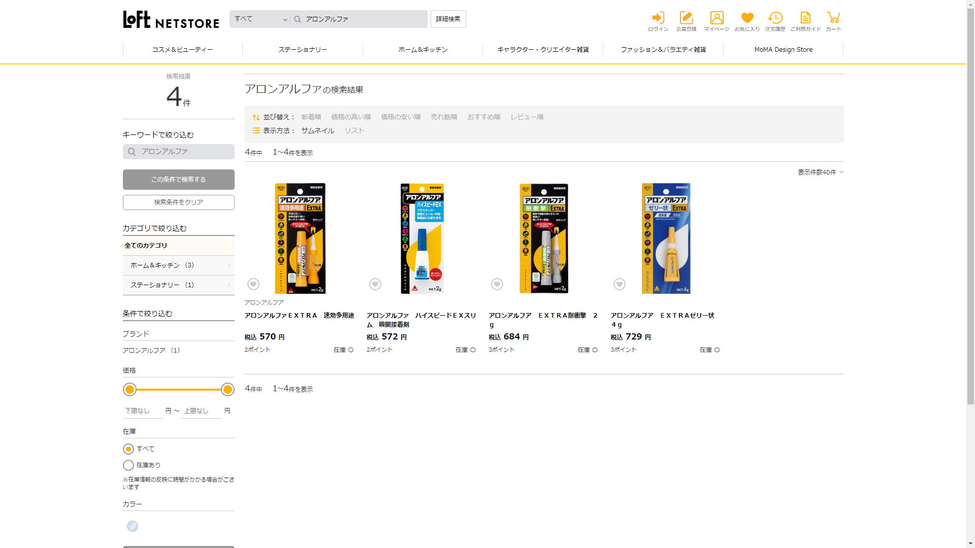 お調べしたところ現在、ロフトではアロンアルファに関連する商品が販売されています。
