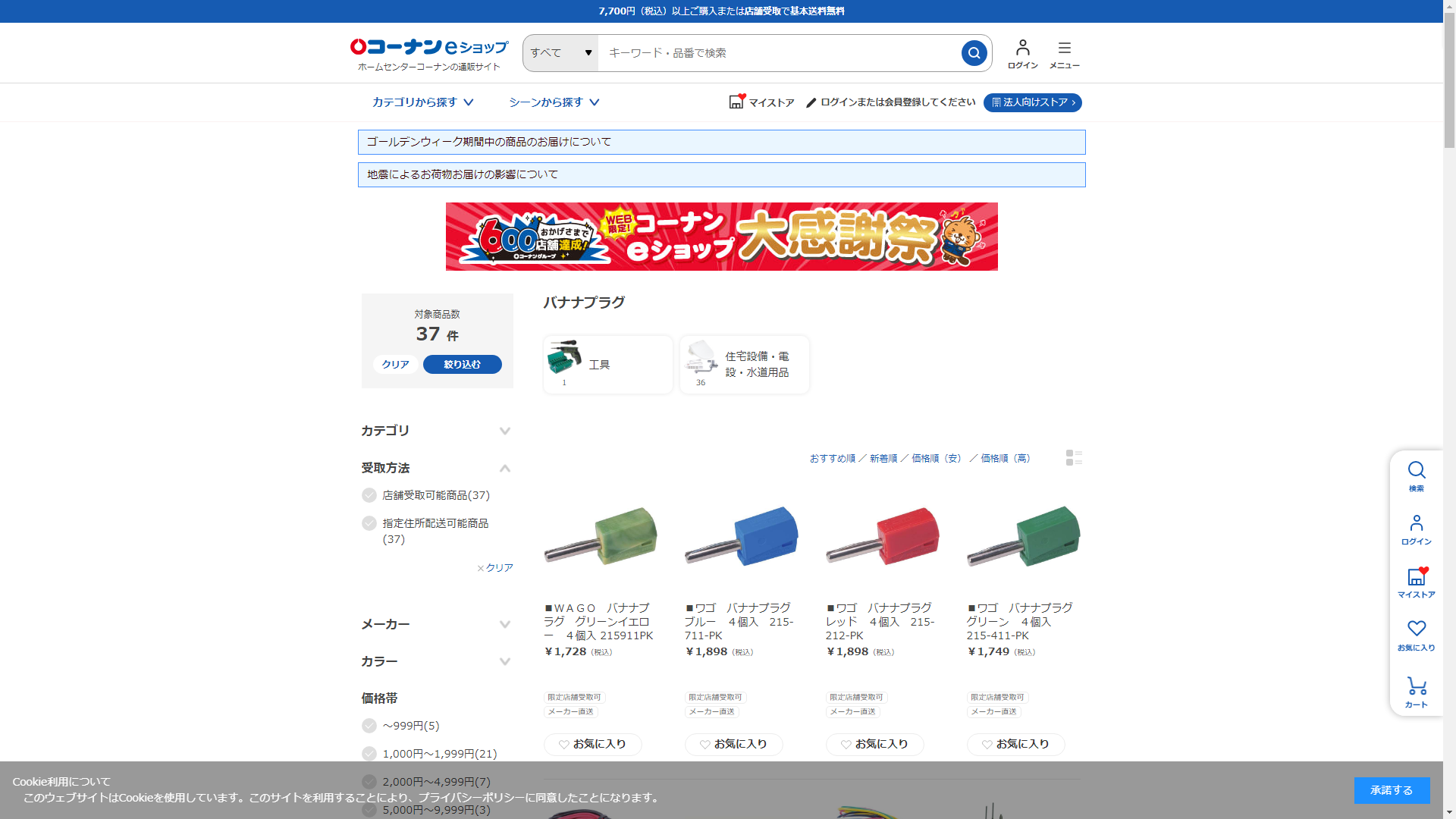 お調べしたところ現在、ホームセンターコーナンではバナナプラグに関連する商品を買うことが可能です。