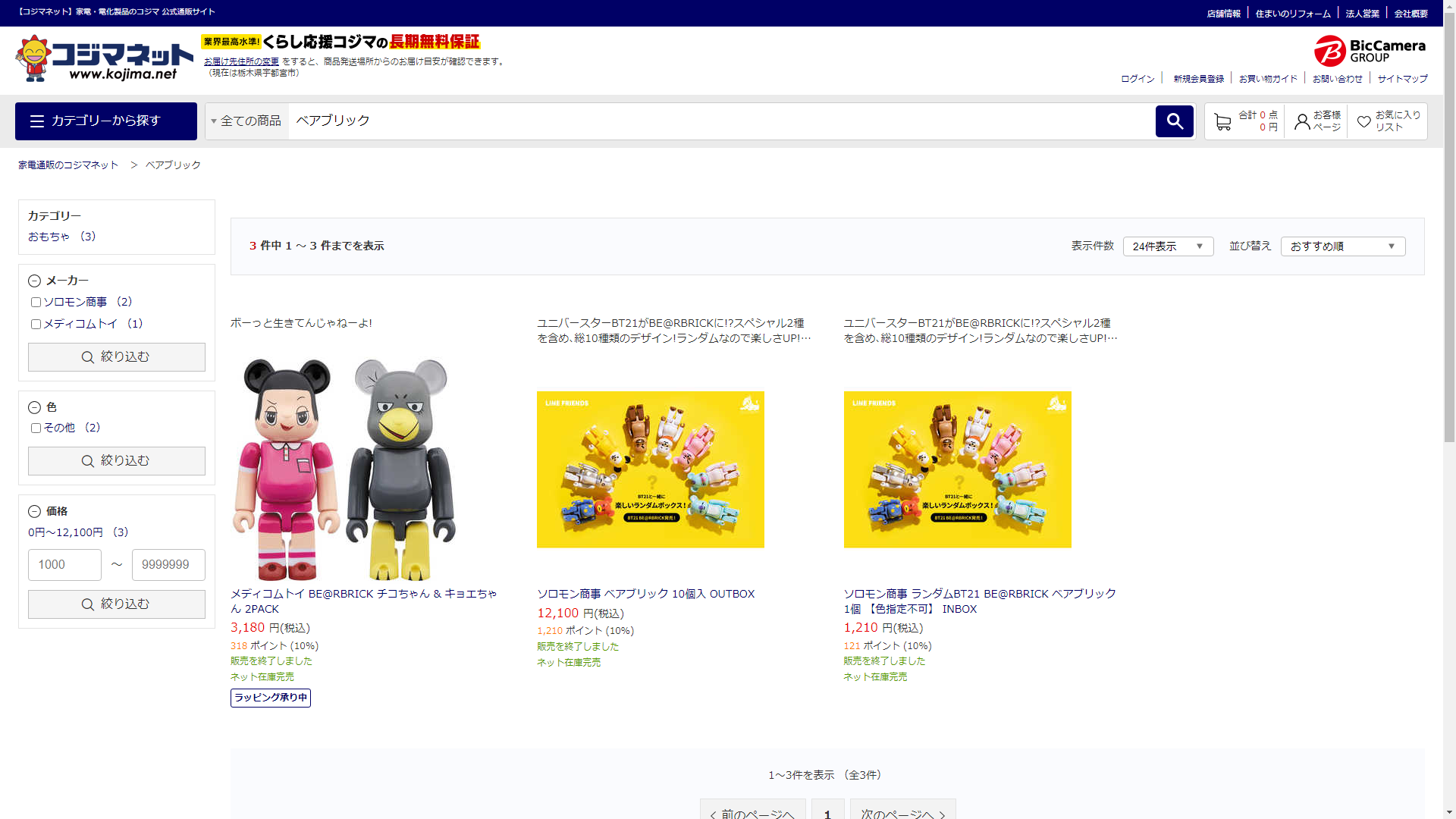 ベアブリックは家電・電化製品のコジマで販売されています