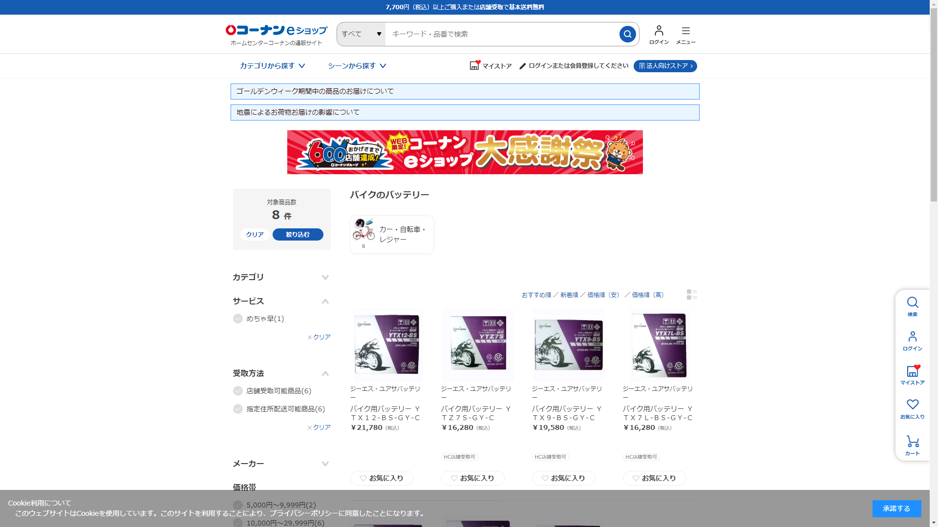 お調べしたところ現在、ホームセンターコーナンではバイクのバッテリーに関連する商品を買うことが可能です。