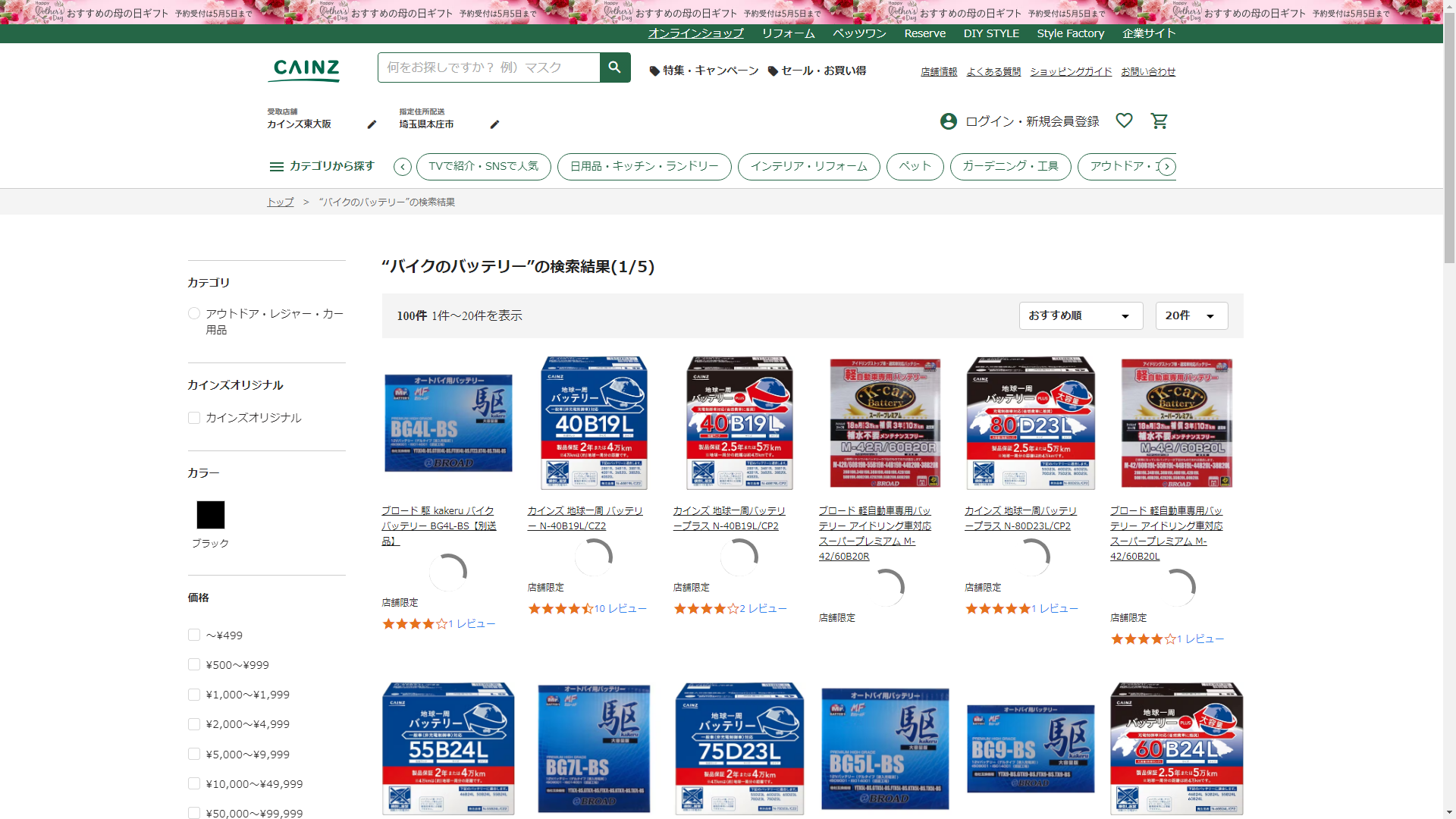 お調べしたところ現在、CAINZではバイクのバッテリーの関連する商品が販売されています。