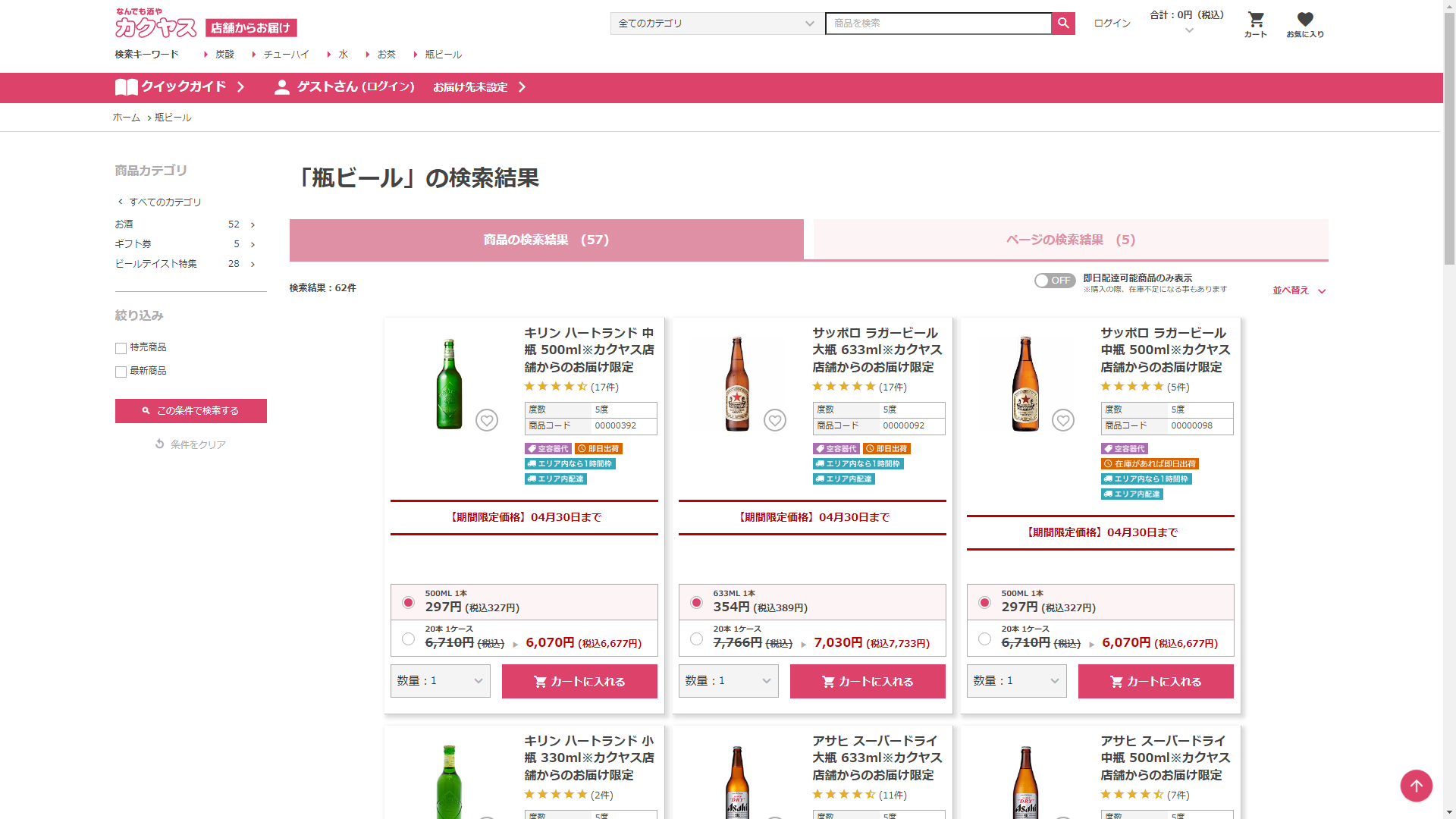 お調べしたところ現在、なんでも酒やカクヤスでは瓶ビールに関連する商品を買うことが可能です。