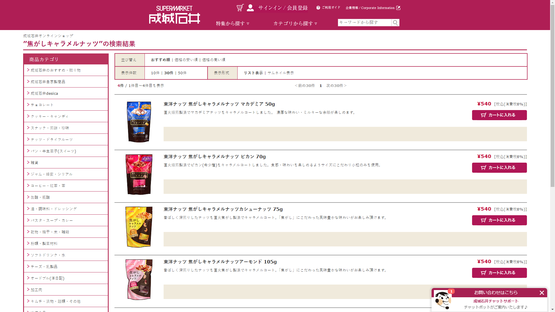 お調べしたところ現在、成城石井では焦がしキャラメルナッツに関連する商品が販売されています。
