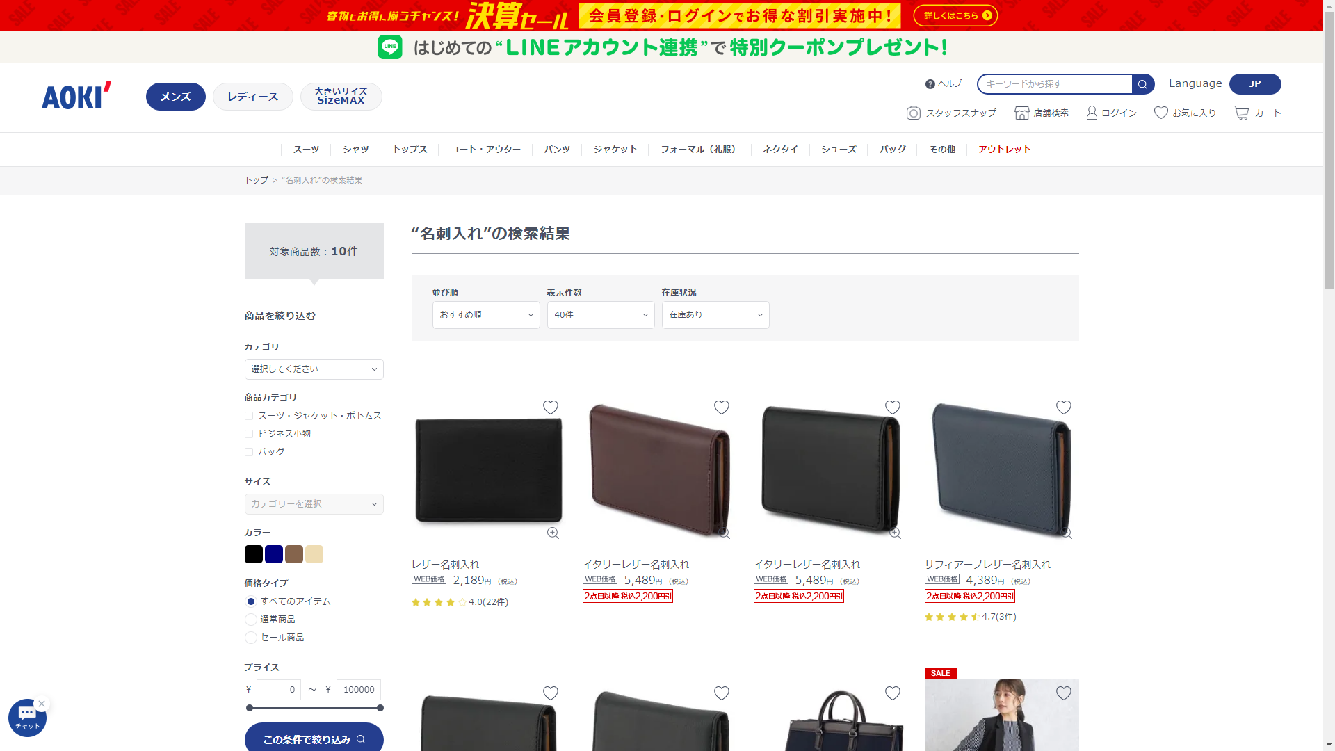 お調べしたところ現在、スーツのAOKIでは名刺入れに関連する商品を買うことが可能です。