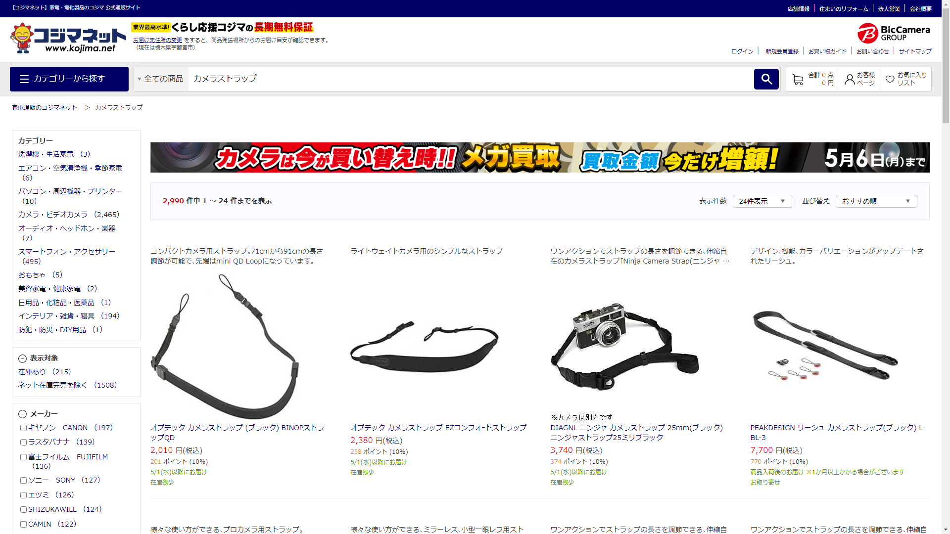 お調べしたところ現在、家電・電化製品のコジマではカメラストラップの関連する商品が販売されています。