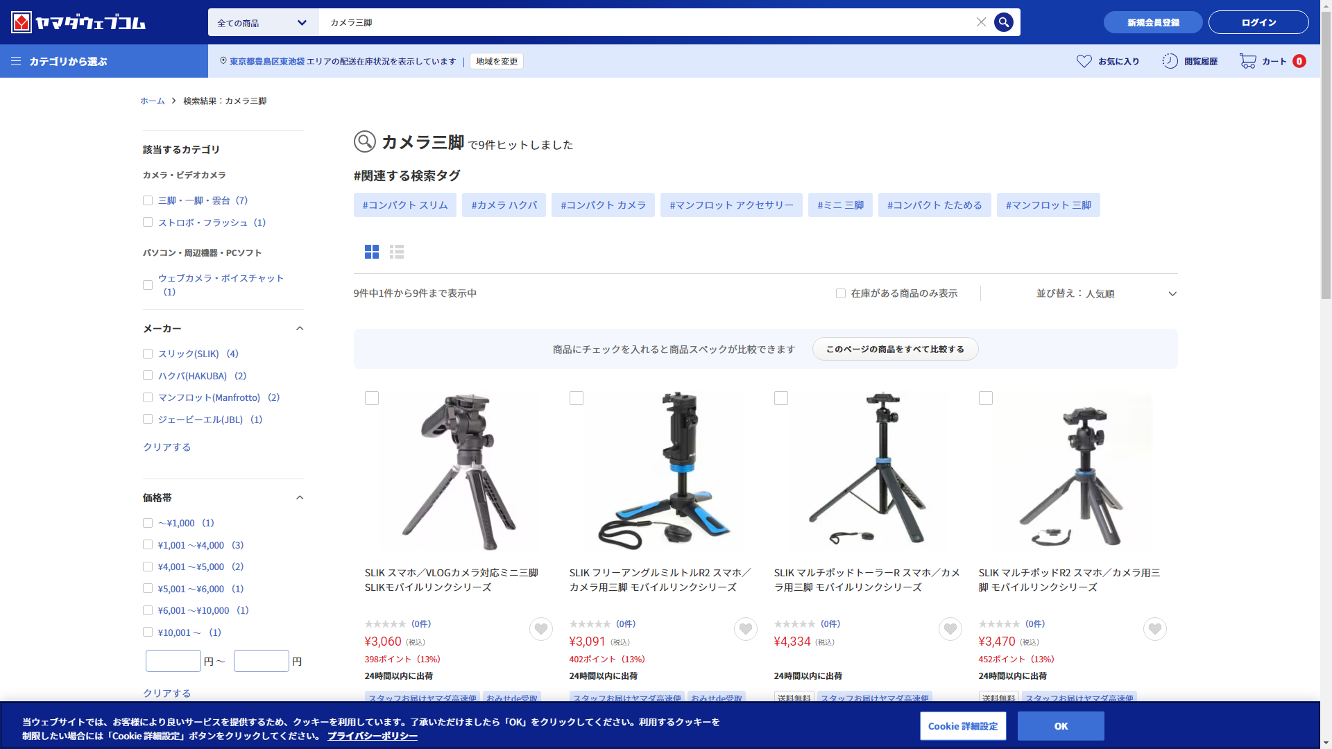 カメラ三脚は家電・電化製品のコジマに売っています