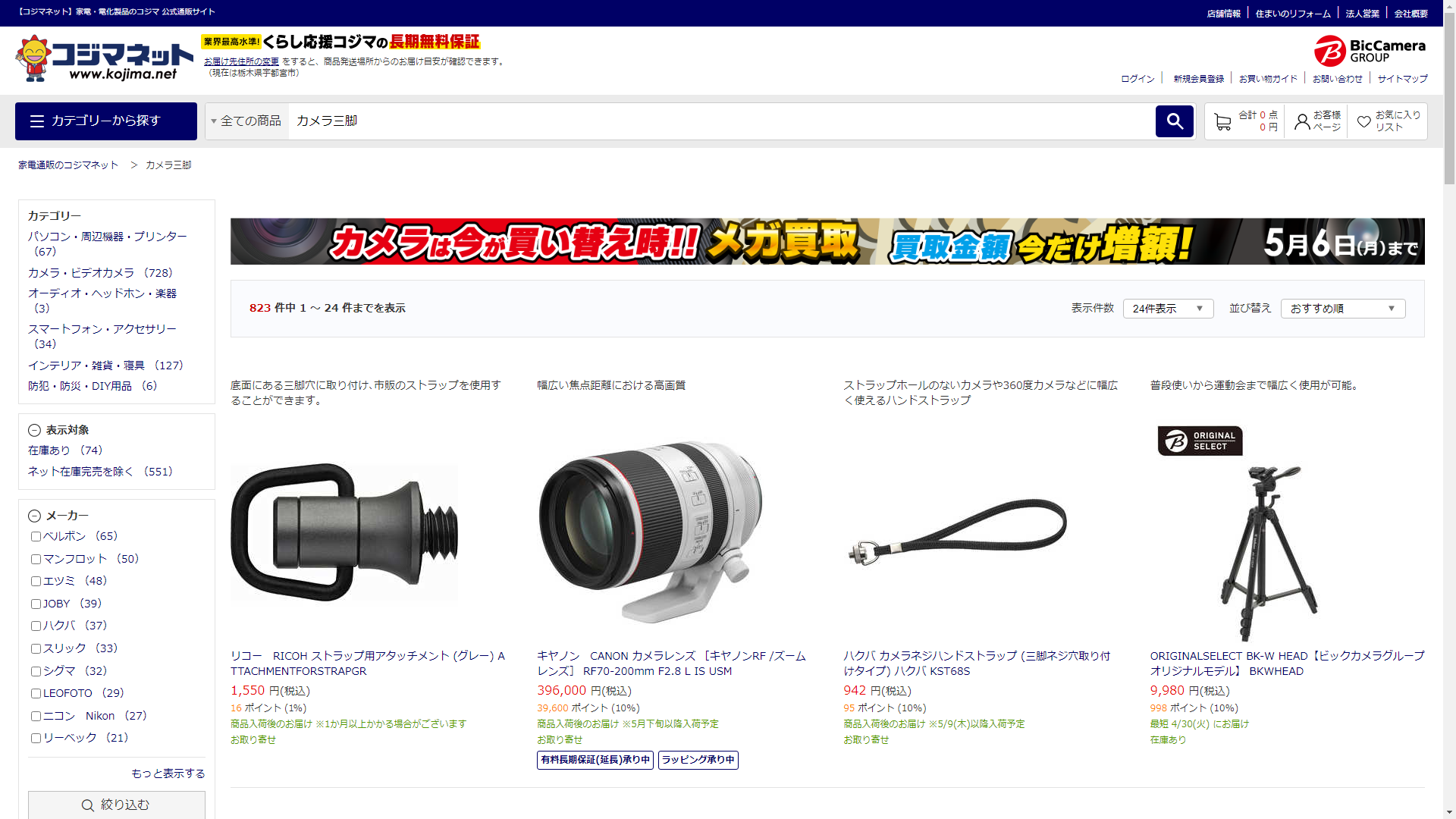 お調べしたところ現在、家電・電化製品のコジマではカメラ三脚の関連する商品が販売されています。