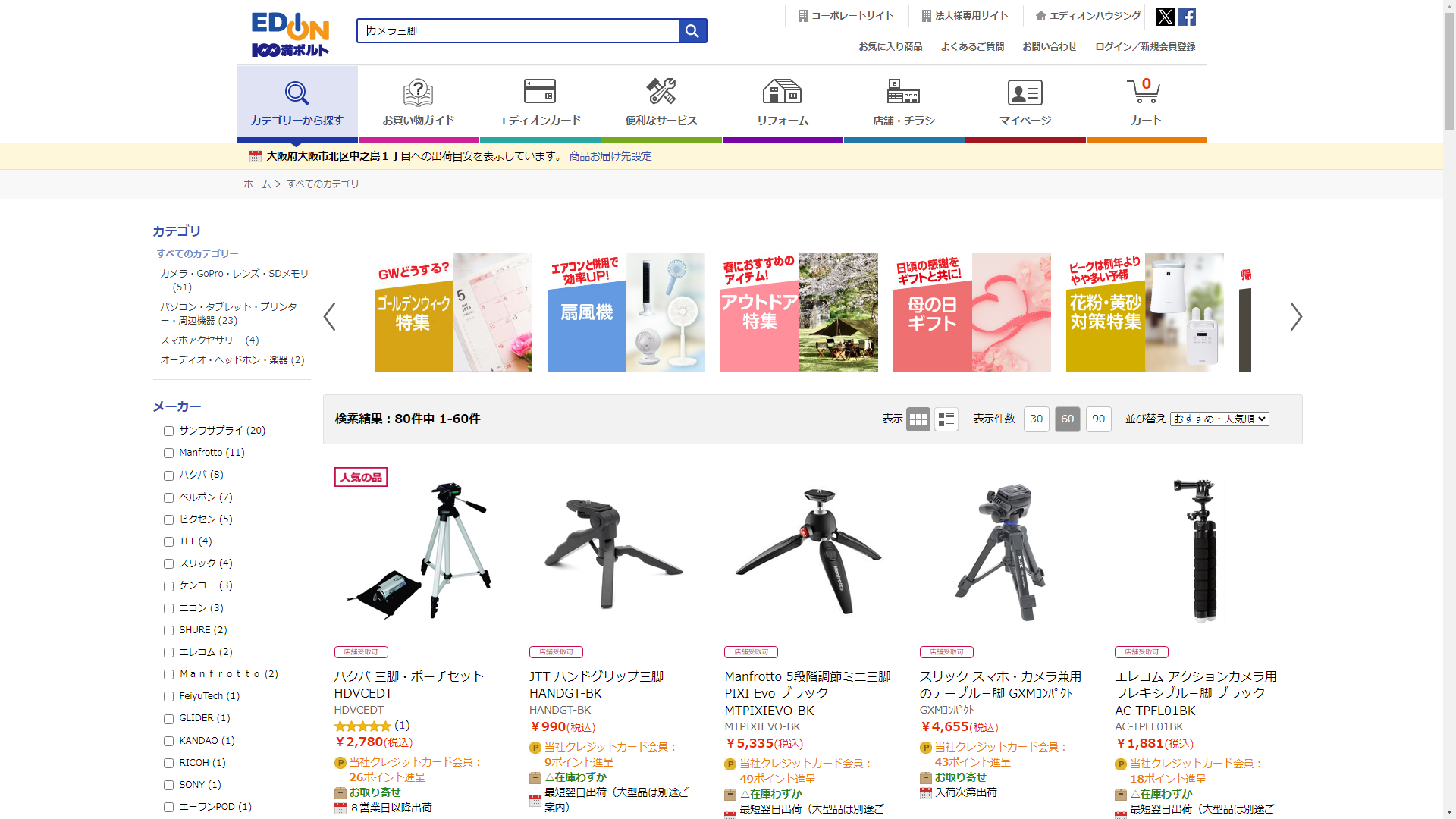 カメラ三脚はEDIONで販売されています