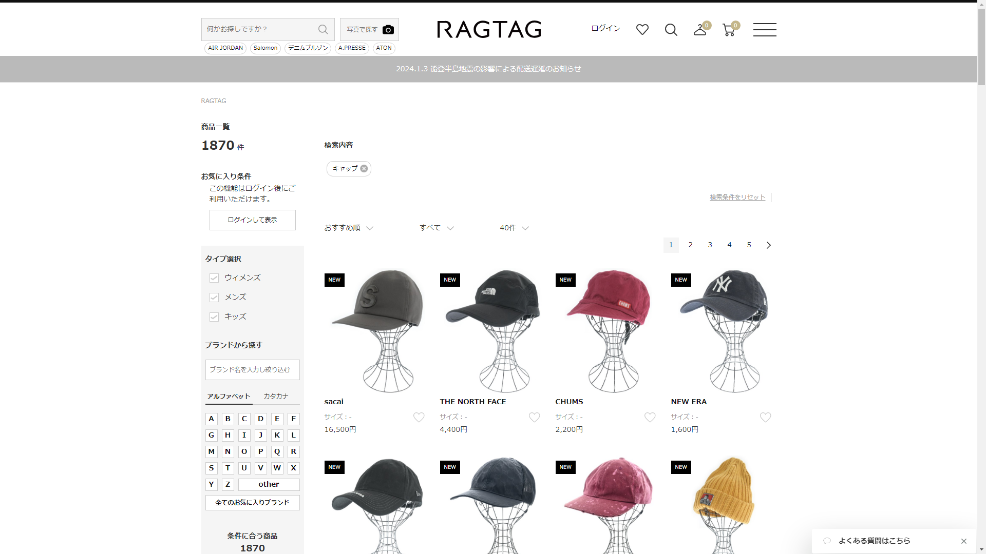 お調べしたところ現在、RAGTAGではキャップに関連する商品を買うことが可能です。