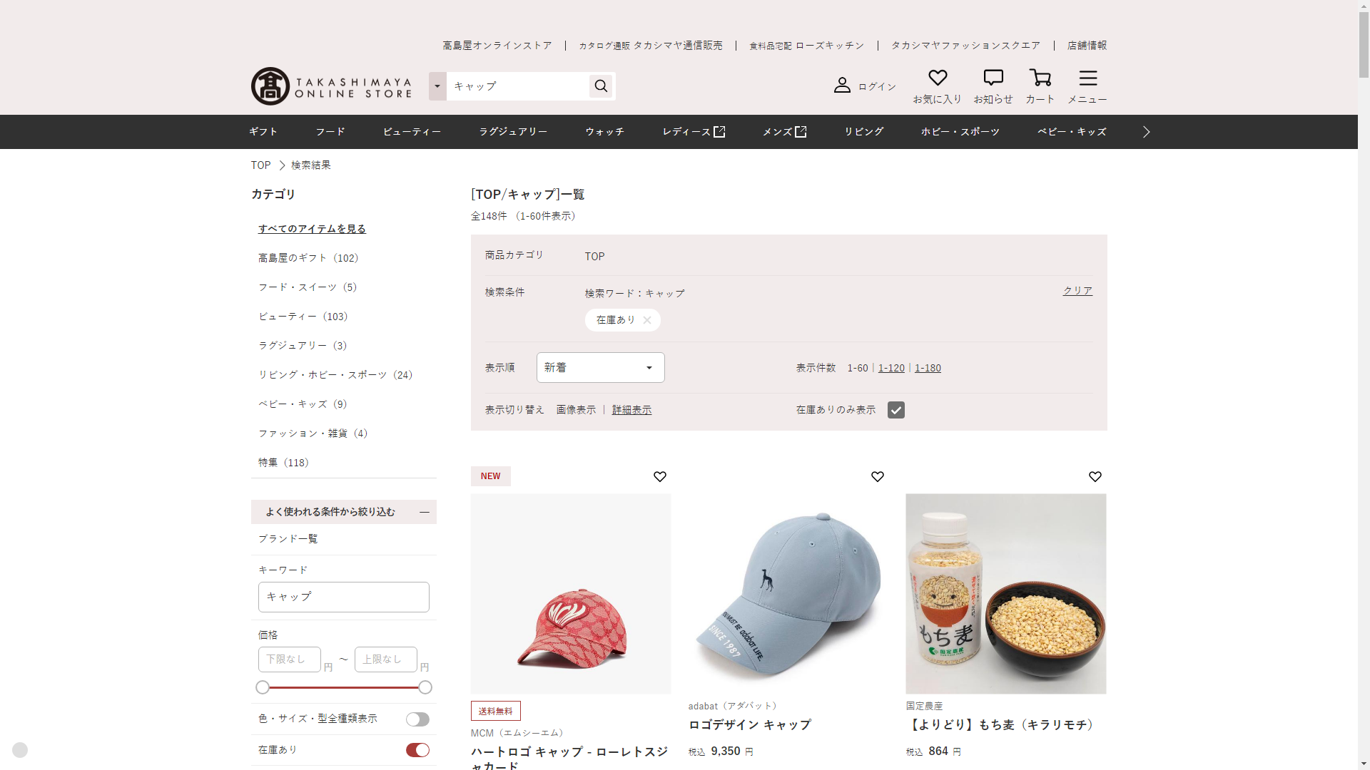 お調べしたところ現在、高島屋ではキャップに関連する商品が販売されています。