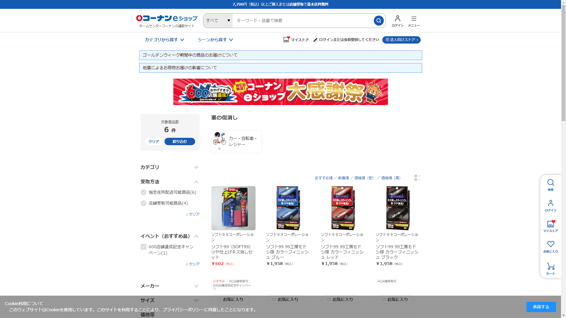 お調べしたところ現在、ホームセンターコーナンでは車の傷消しに関連する商品を買うことが可能です。