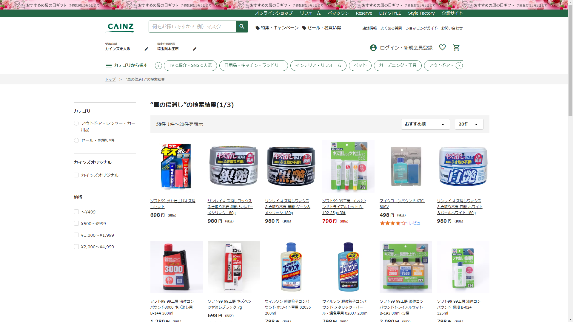 お調べしたところ現在、CAINZでは車の傷消しの関連する商品が販売されています。