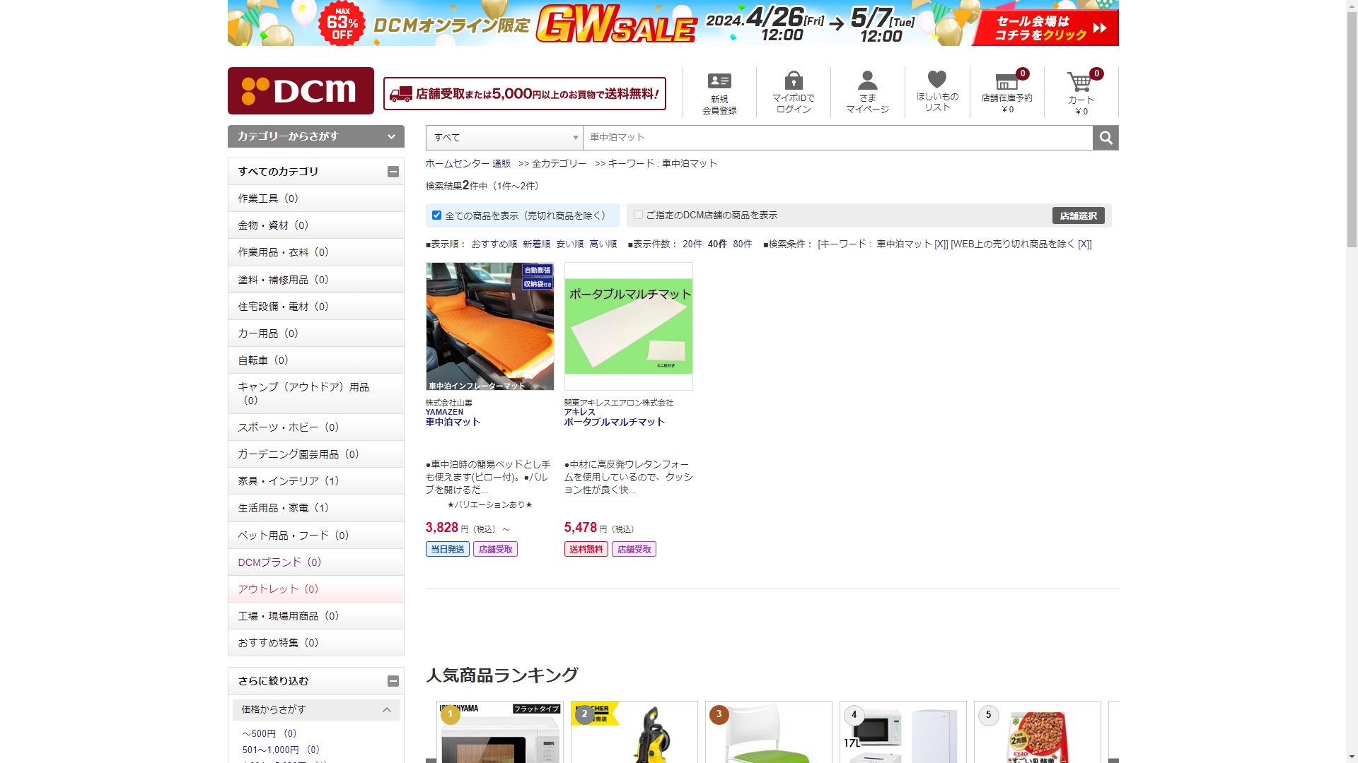 お調べしたところ現在、DCMでは車中泊マットに関連する商品が販売されています。