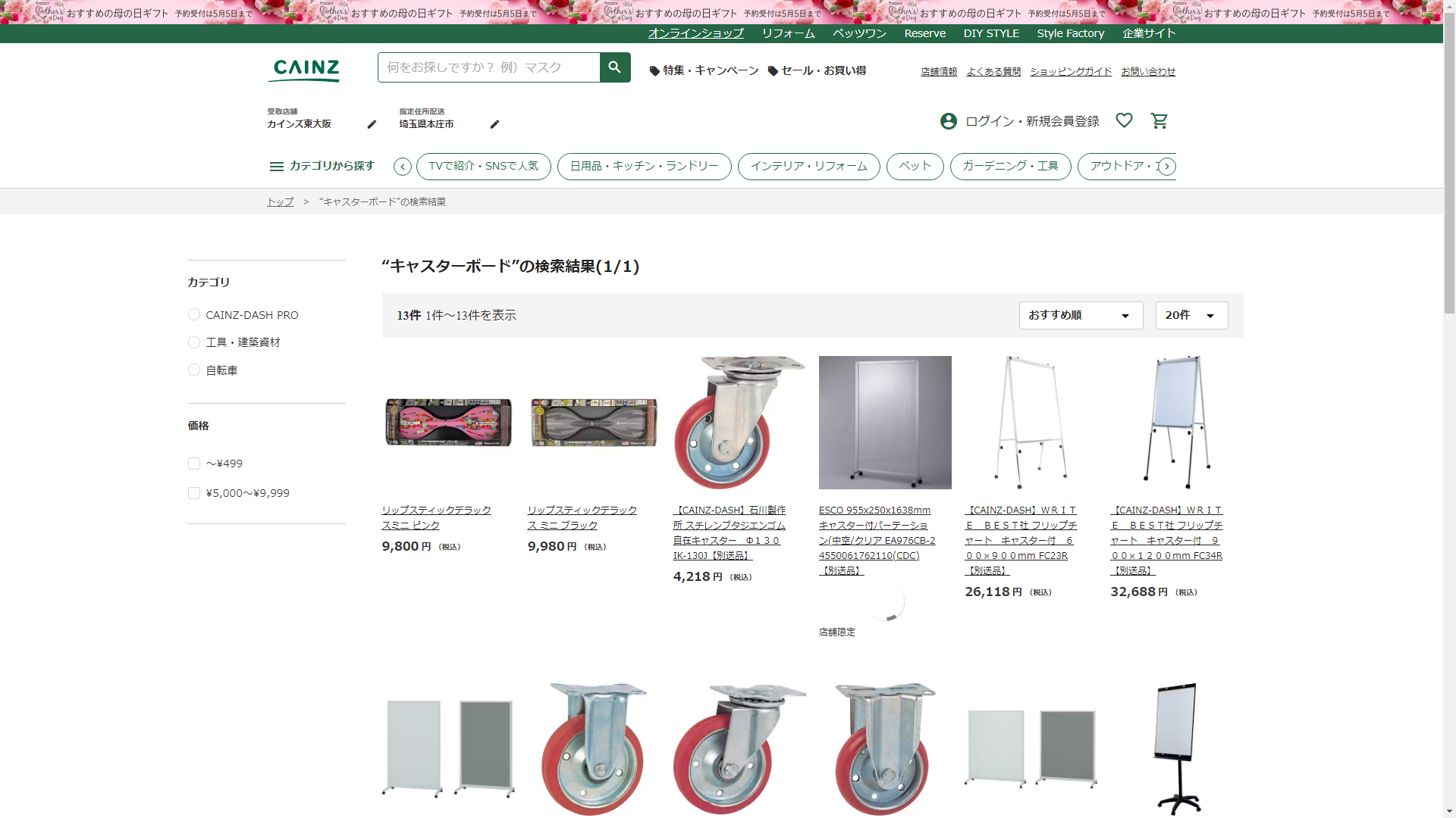 お調べしたところ現在、CAINZではキャスターボードの関連する商品が販売されています。