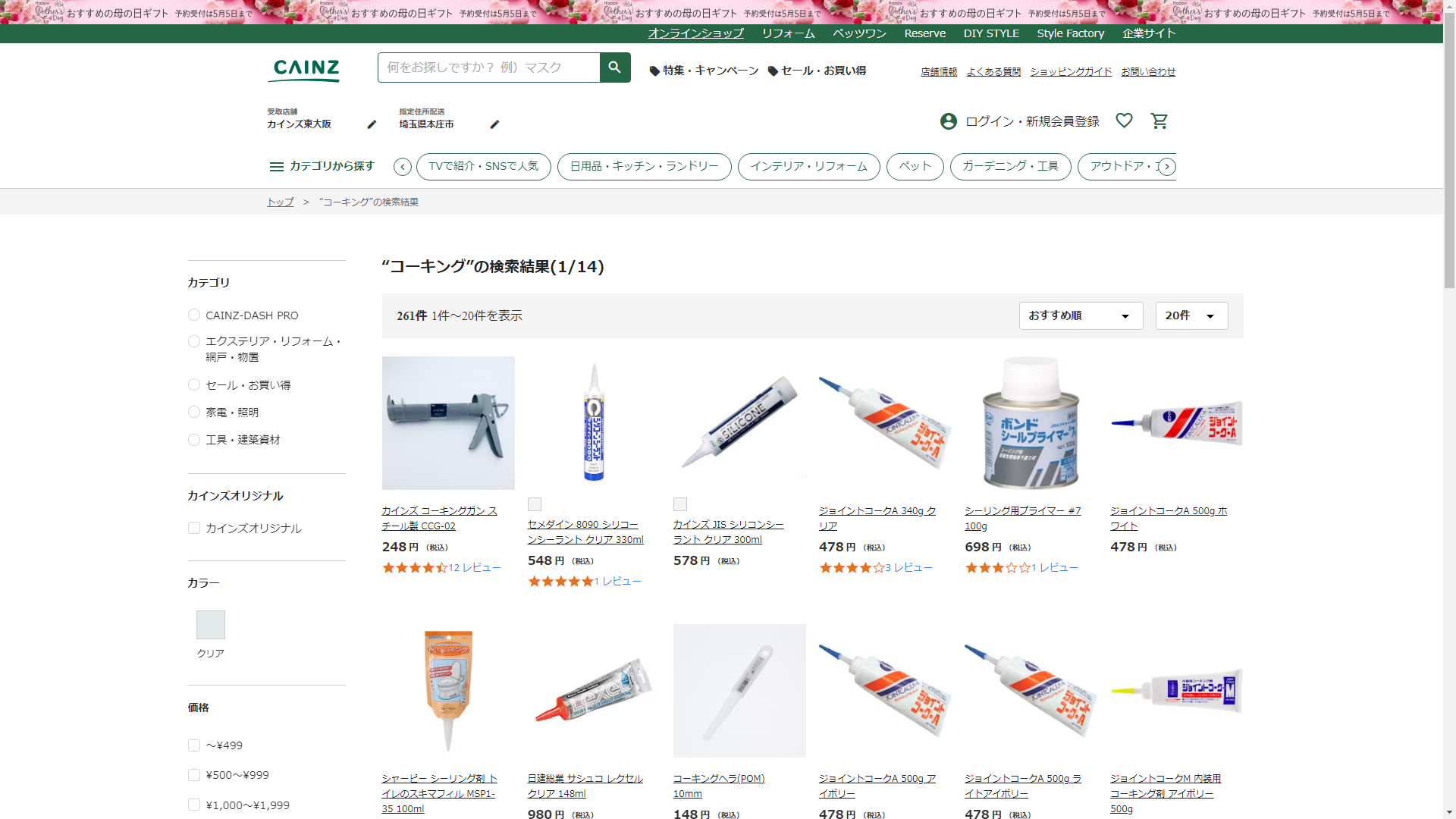お調べしたところ現在、CAINZではコーキングの関連する商品が販売されています。