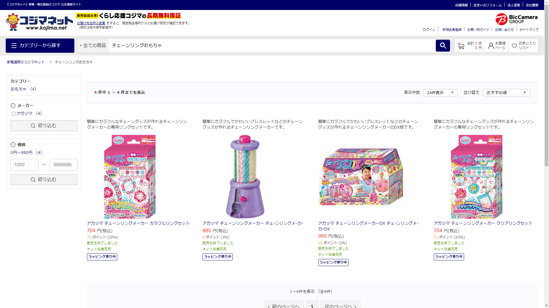 お調べしたところ現在、家電・電化製品のコジマではチェーンリングおもちゃに関連する商品が販売されています。