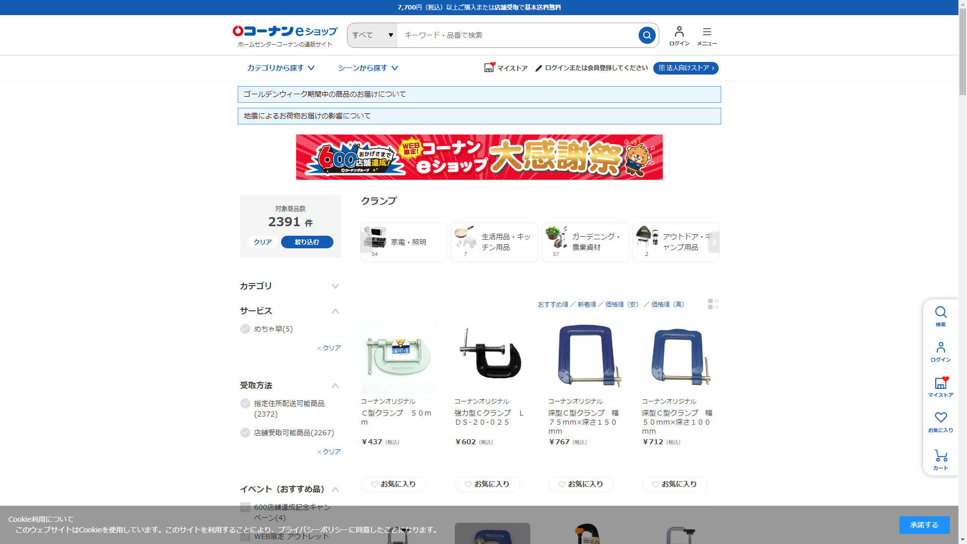 お調べしたところ現在、ホームセンターコーナンではクランプに関連する商品を買うことが可能です。