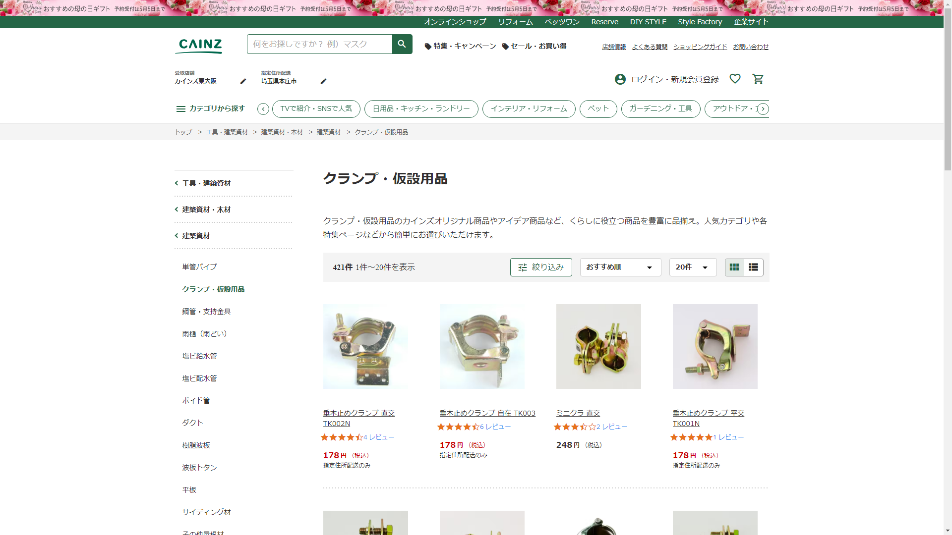 お調べしたところ現在、CAINZではクランプの関連する商品が販売されています。