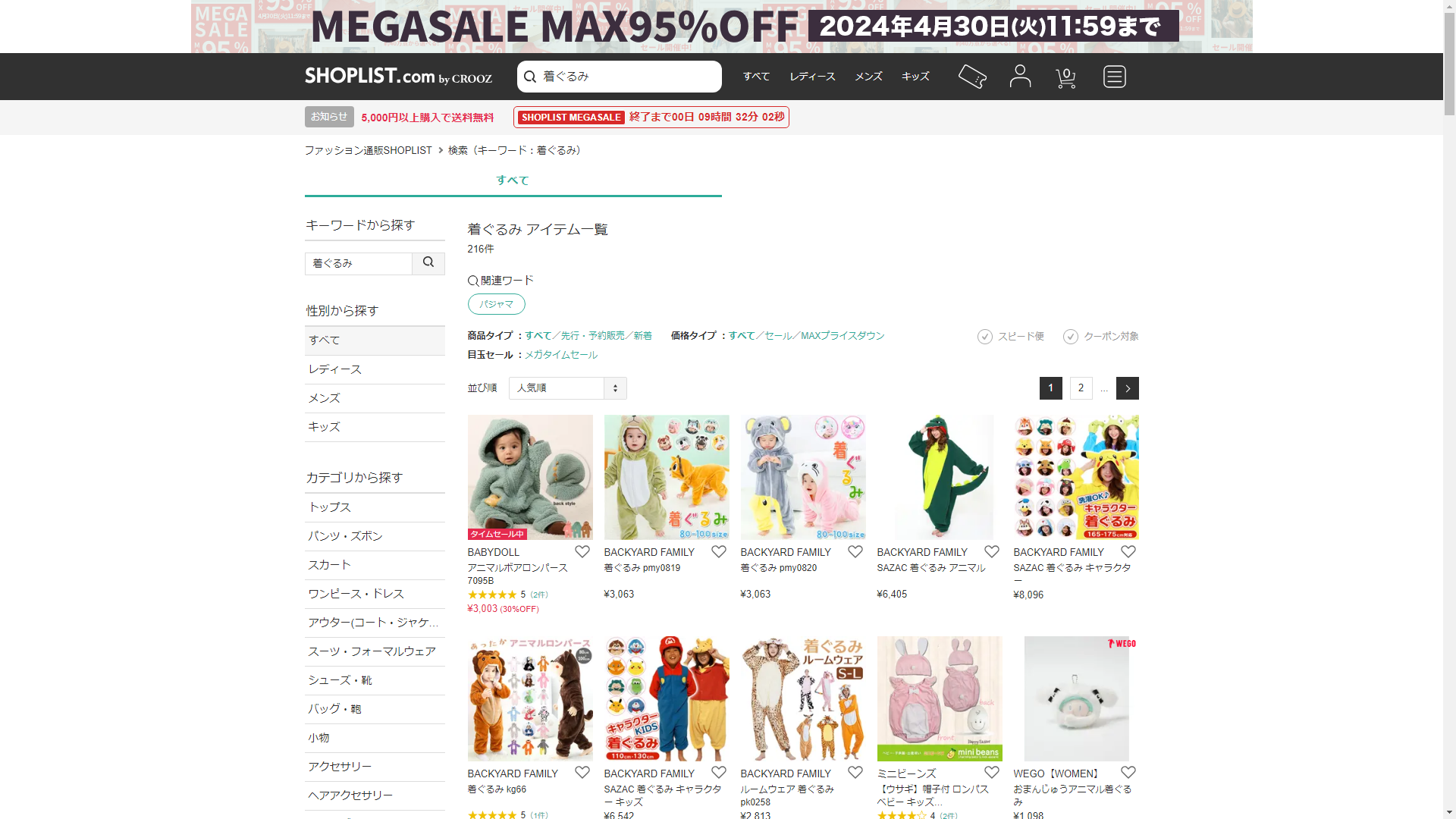 お調べしたところ現在、SHOPLISTでは着ぐるみの関連する商品が販売されています。