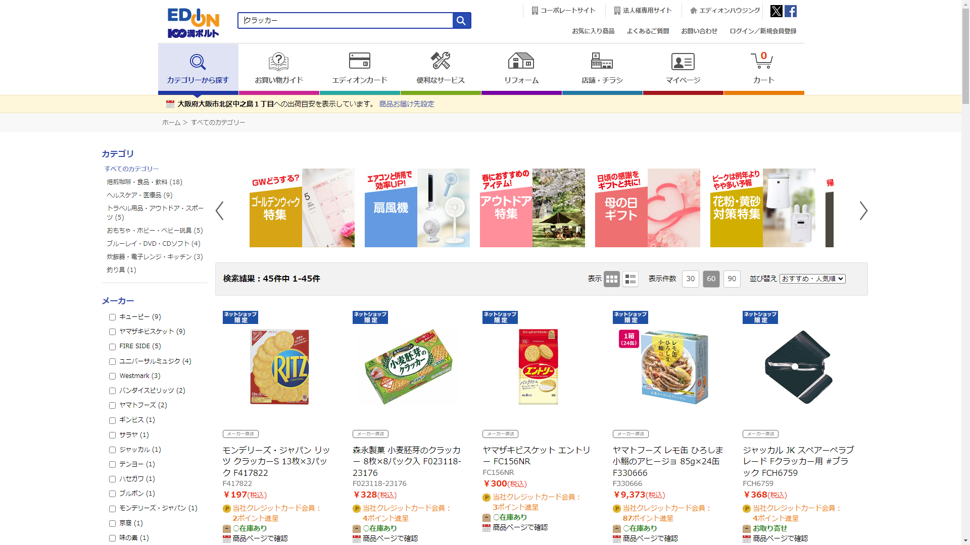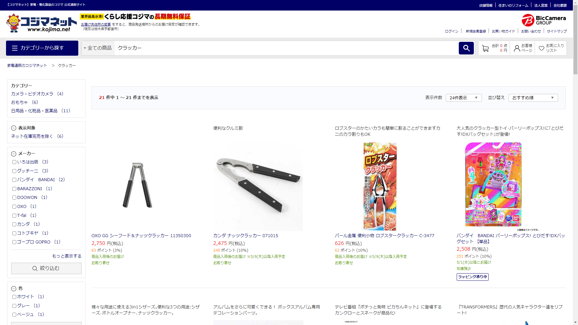 お調べしたところ現在、家電・電化製品のコジマではクラッカーに関連する商品が販売されています。