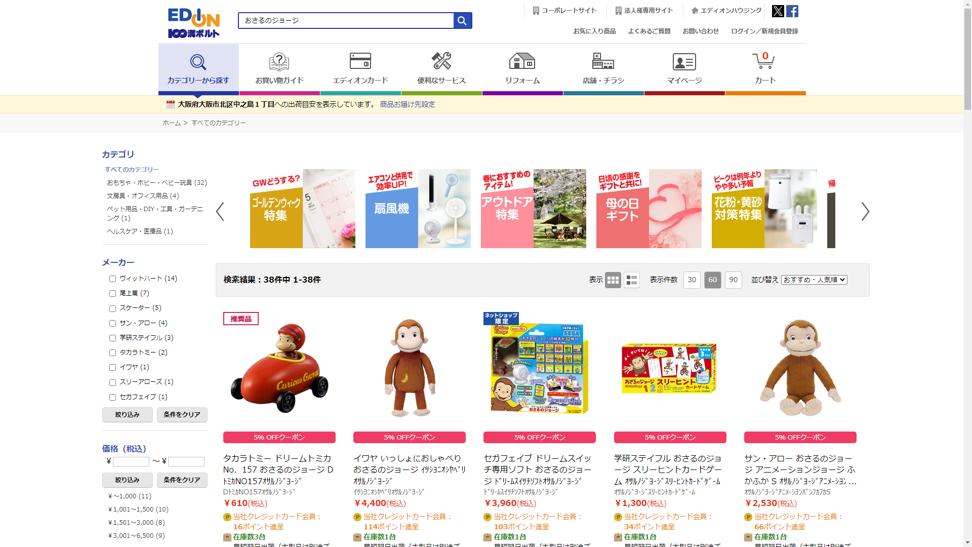 おさるのジョージは家電・電化製品のコジマで販売されています