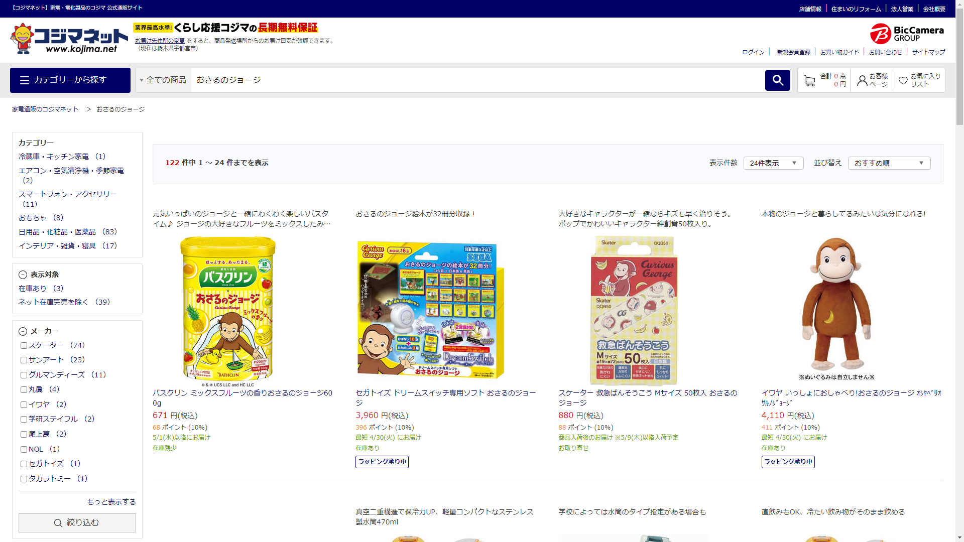 お調べしたところ現在、家電・電化製品のコジマではおさるのジョージに関連する商品が販売されています。