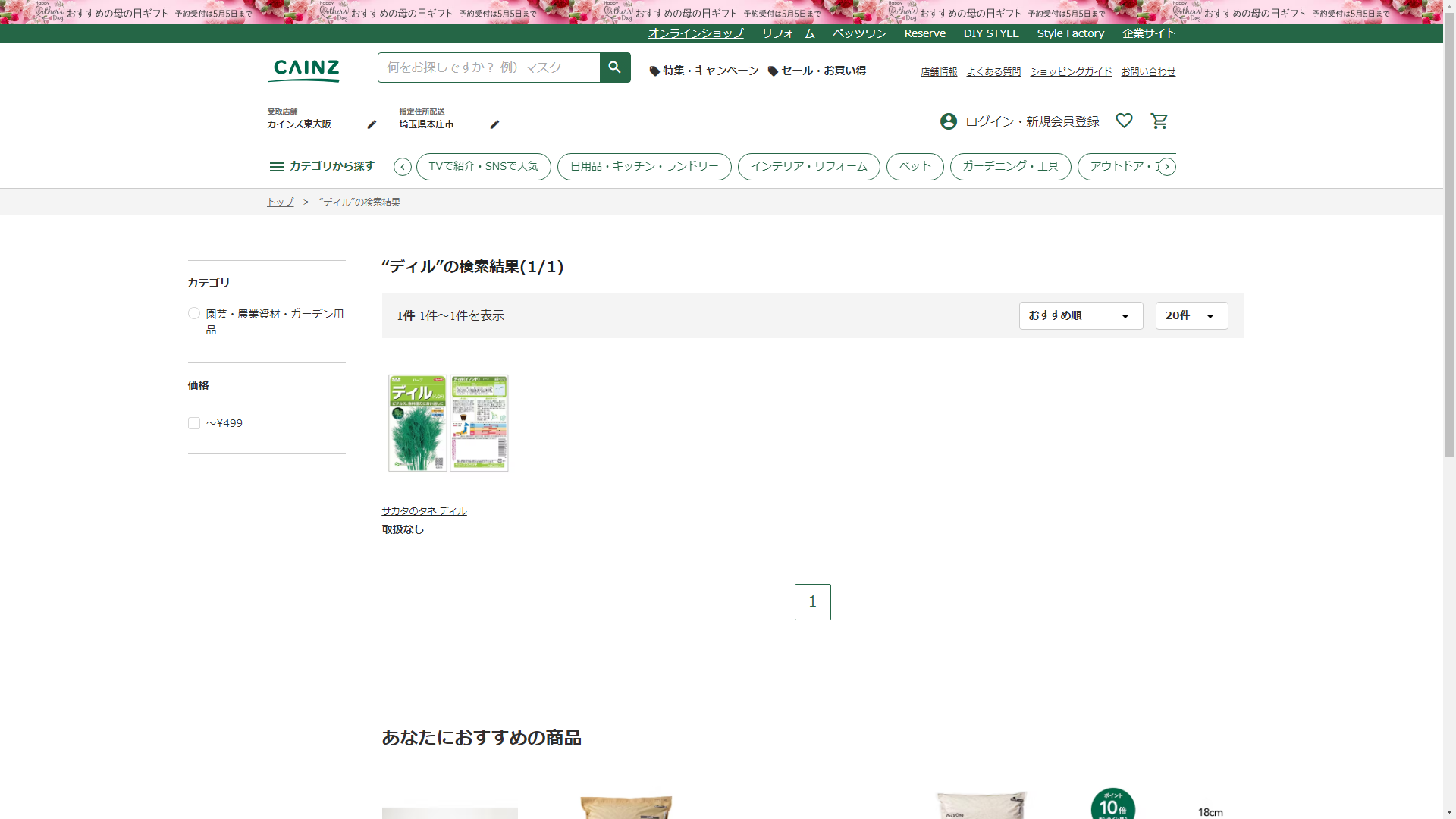 お調べしたところ現在、CAINZではディルの関連する商品が販売されています。