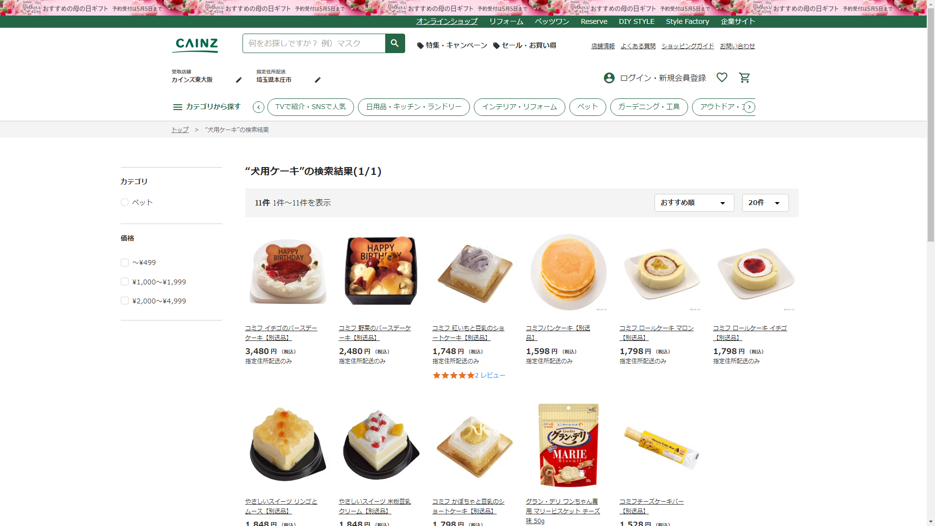 お調べしたところ現在、CAINZでは犬用ケーキの関連する商品が販売されています。
