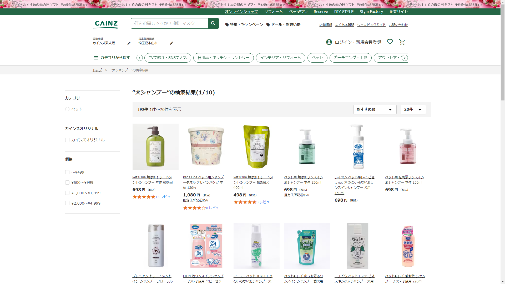 お調べしたところ現在、CAINZでは犬シャンプーの関連する商品が販売されています。