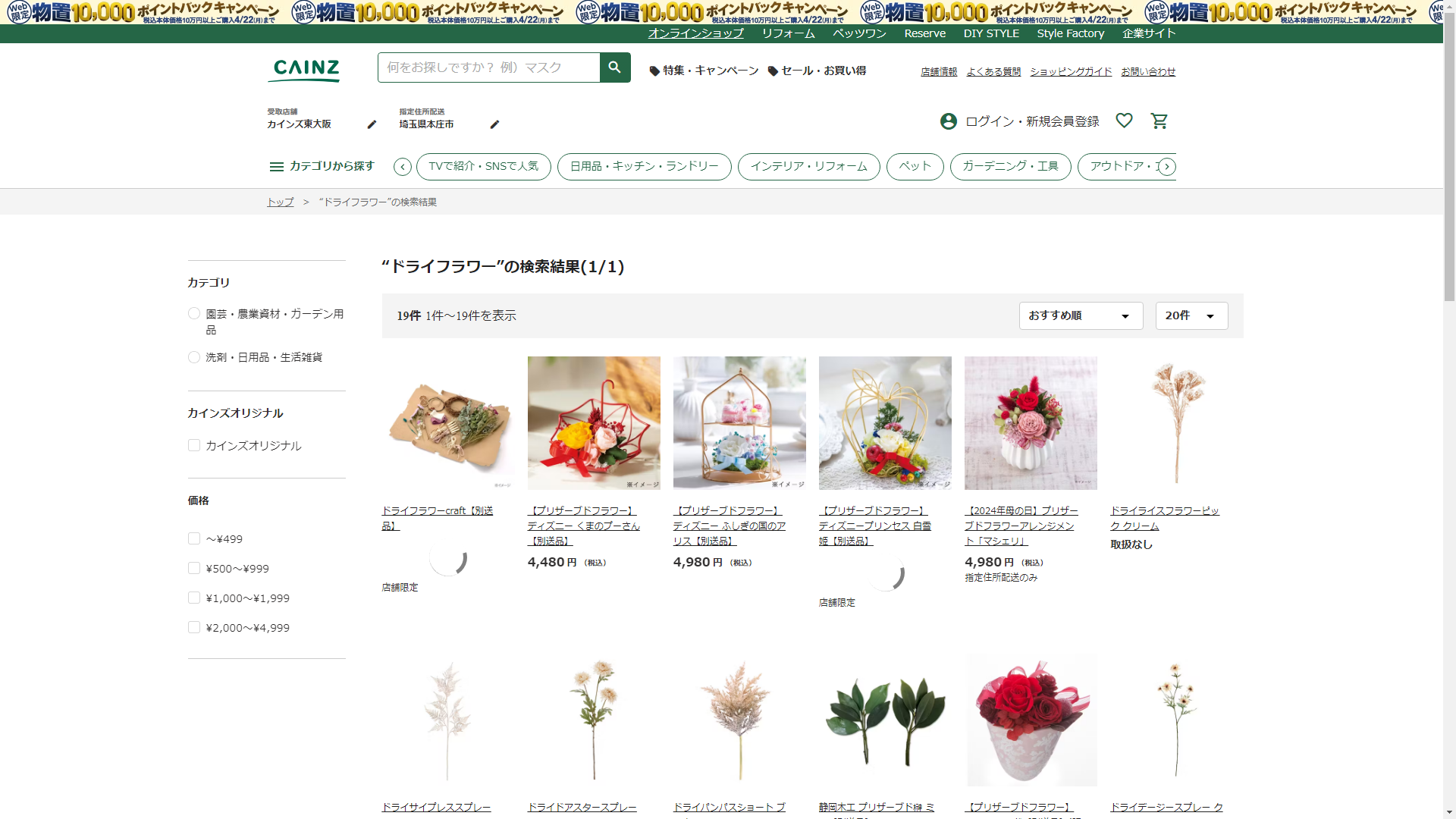 お調べしたところ現在、CAINZではドライフラワーの関連する商品が販売されています。