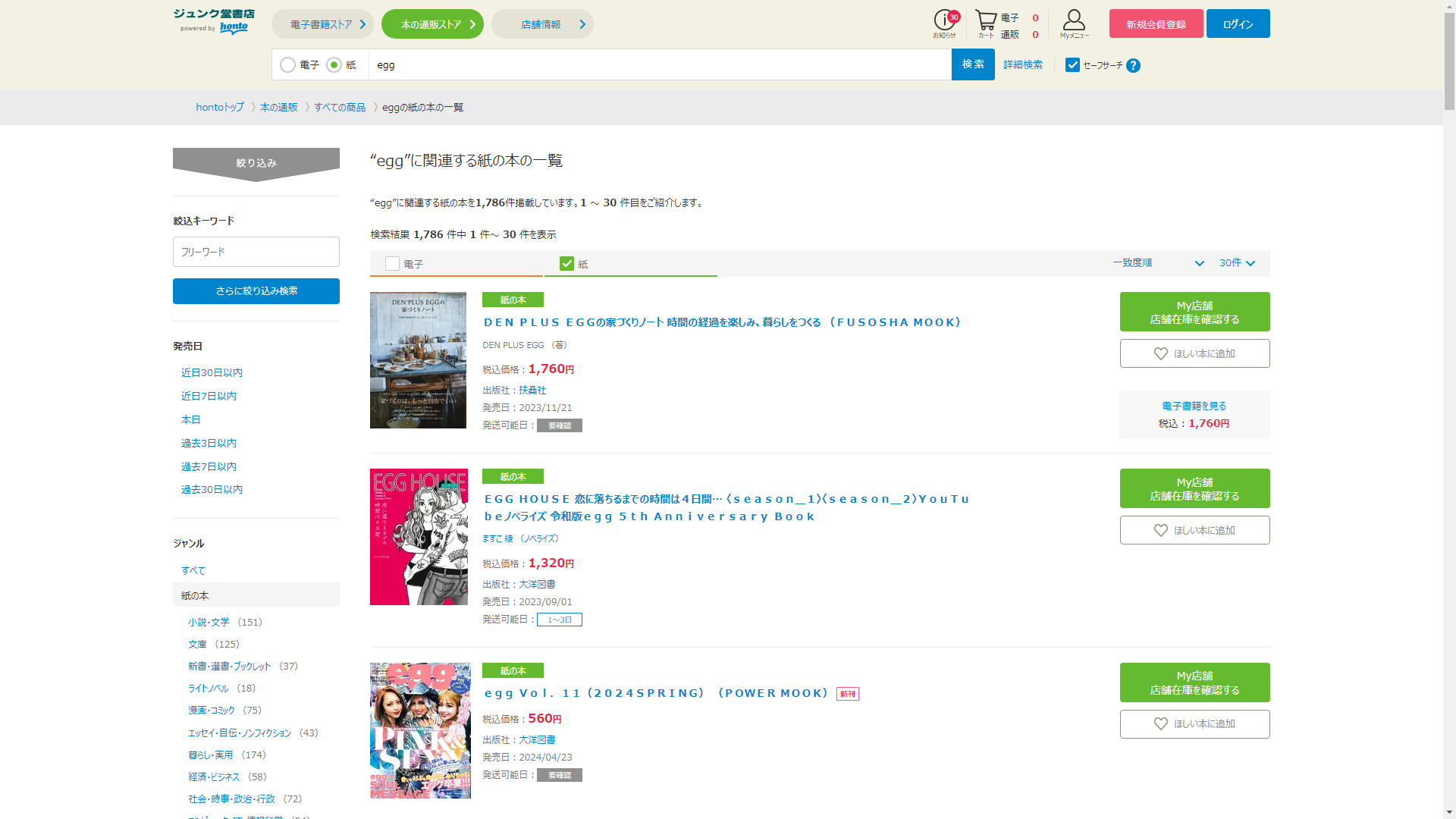 お調べしたところ現在、ジュンク堂書店ではeggの関連する商品が販売されています。