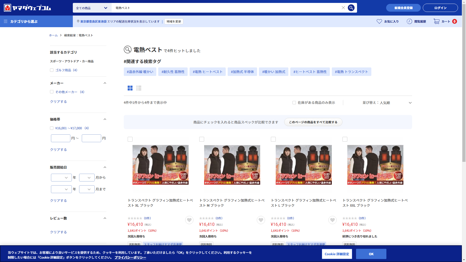 お調べしたところ現在、ヤマダデンキでは電熱ベストに関連する商品を買うことが可能です。