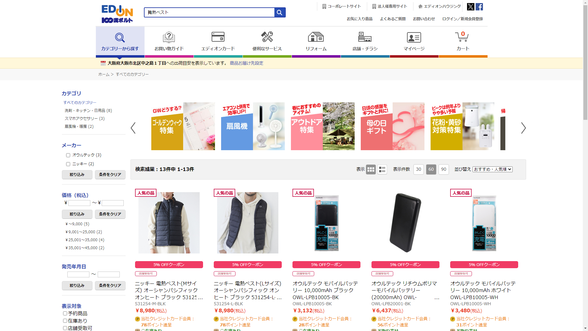 お調べしたところ現在、EDIONでは電熱ベストに関連する商品が販売されています。