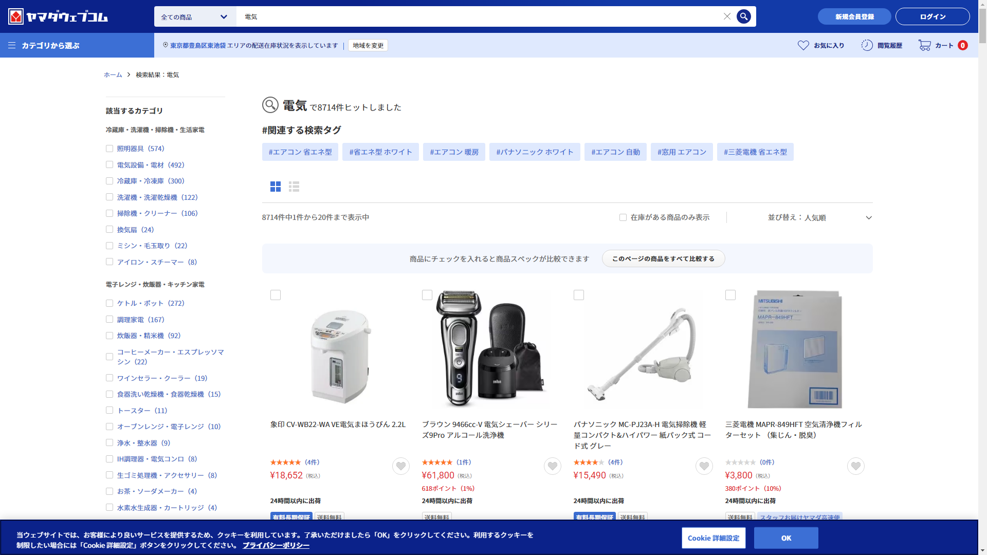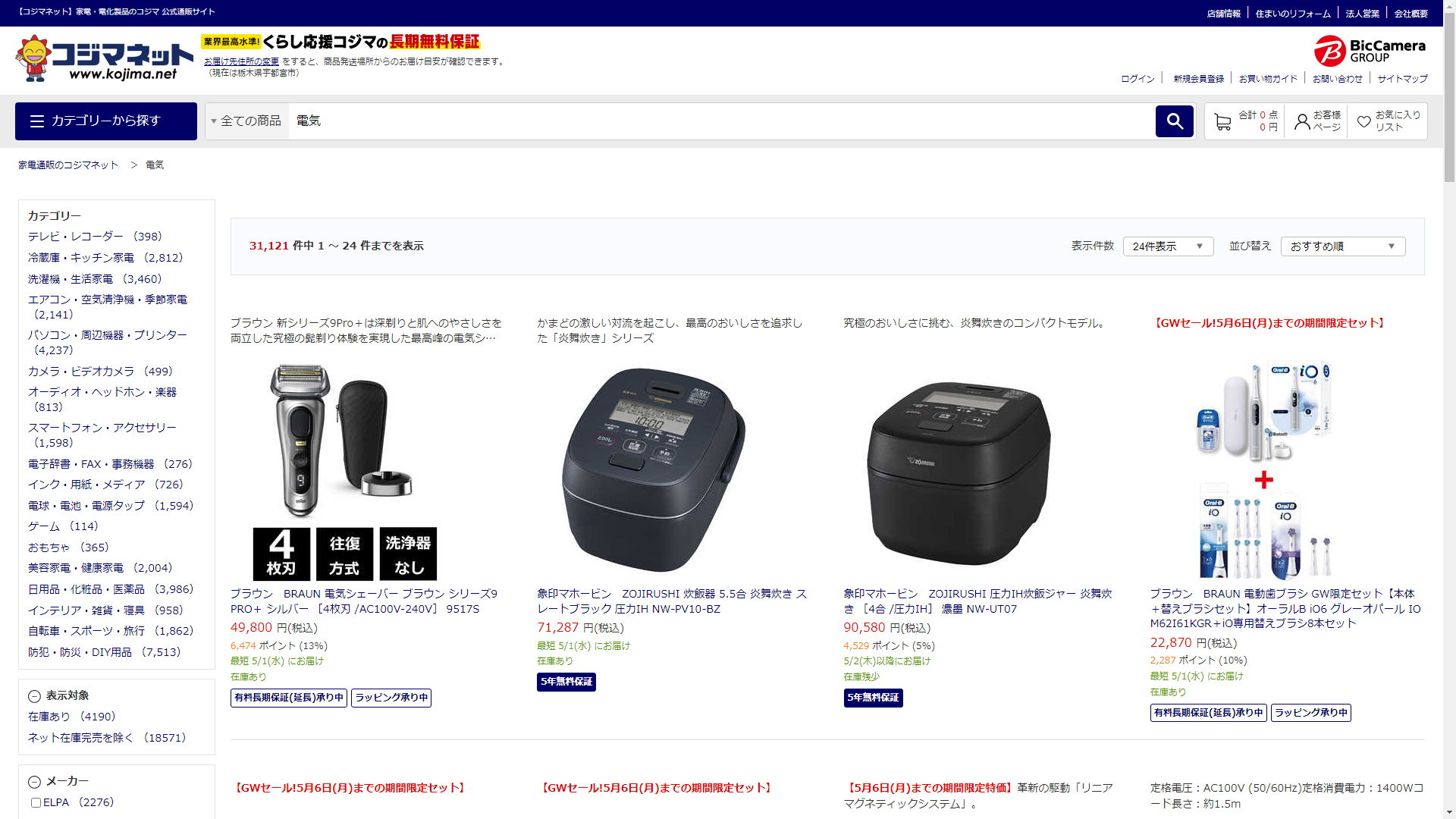 お調べしたところ現在、家電・電化製品のコジマでは電気の関連する商品が販売されています。