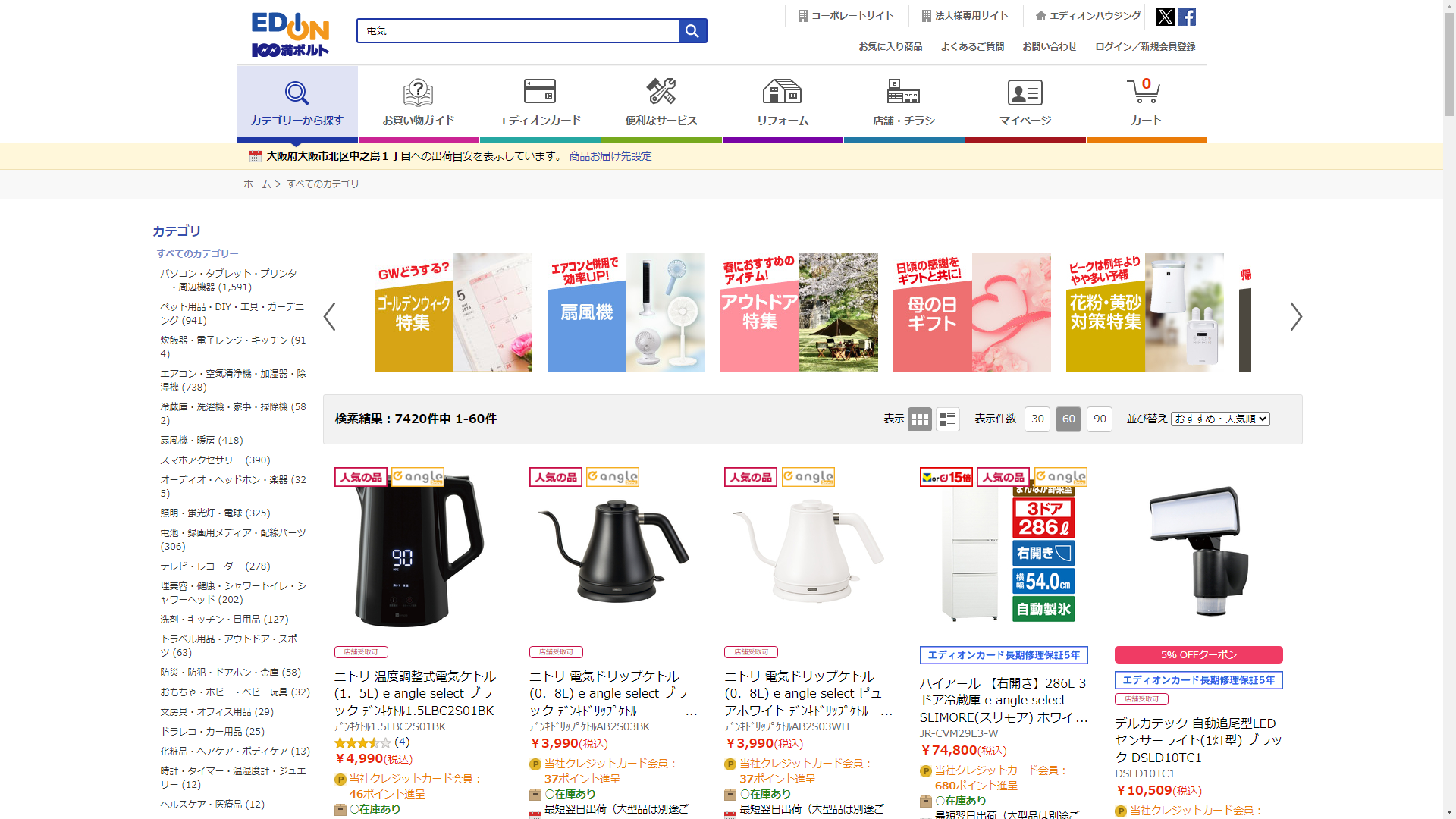 お調べしたところ現在、EDIONでは電気に関連する商品が販売されています。