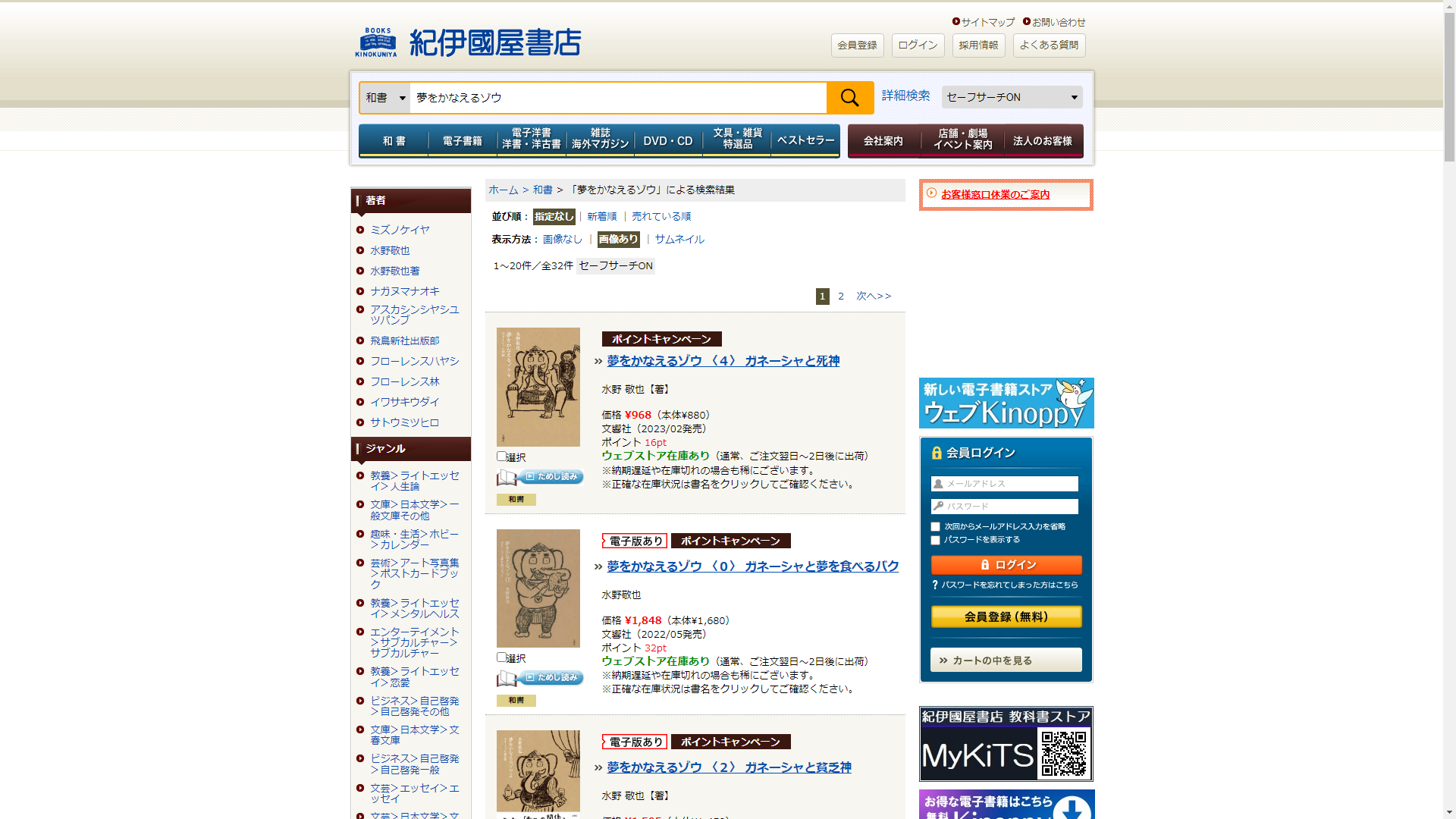 お調べしたところ現在、紀伊國屋書店では夢をかなえるゾウに関連する商品を買うことが可能です。