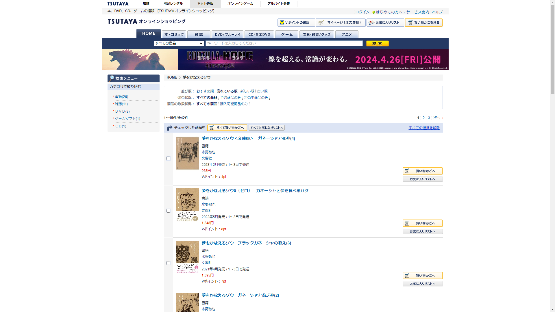 お調べしたところ現在、ジュンク堂書店では夢をかなえるゾウの関連する商品が販売されています。