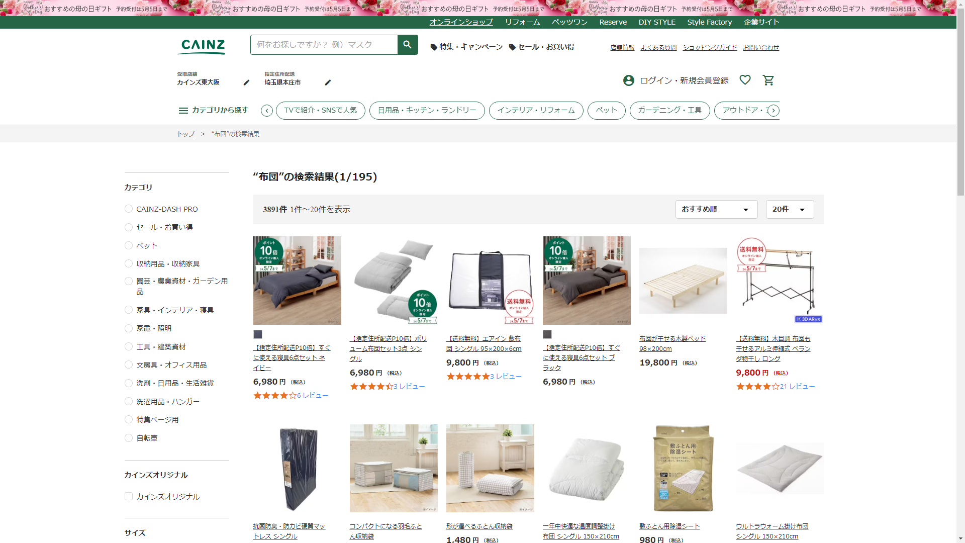 お調べしたところ現在、CAINZでは布団の関連する商品が販売されています。