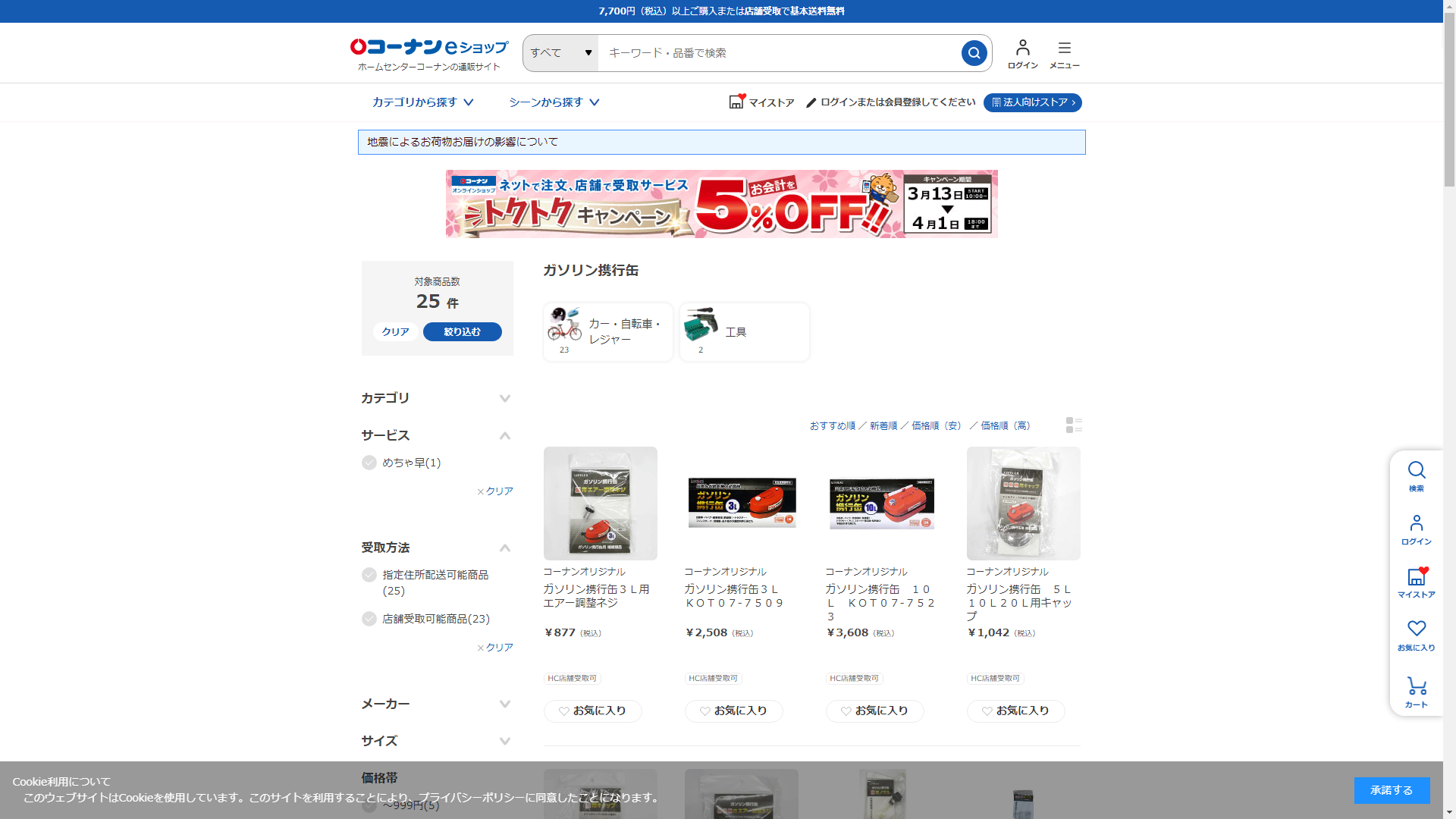 お調べしたところ現在、ホームセンターコーナンではガソリン携行缶に関連する商品を買うことが可能です。