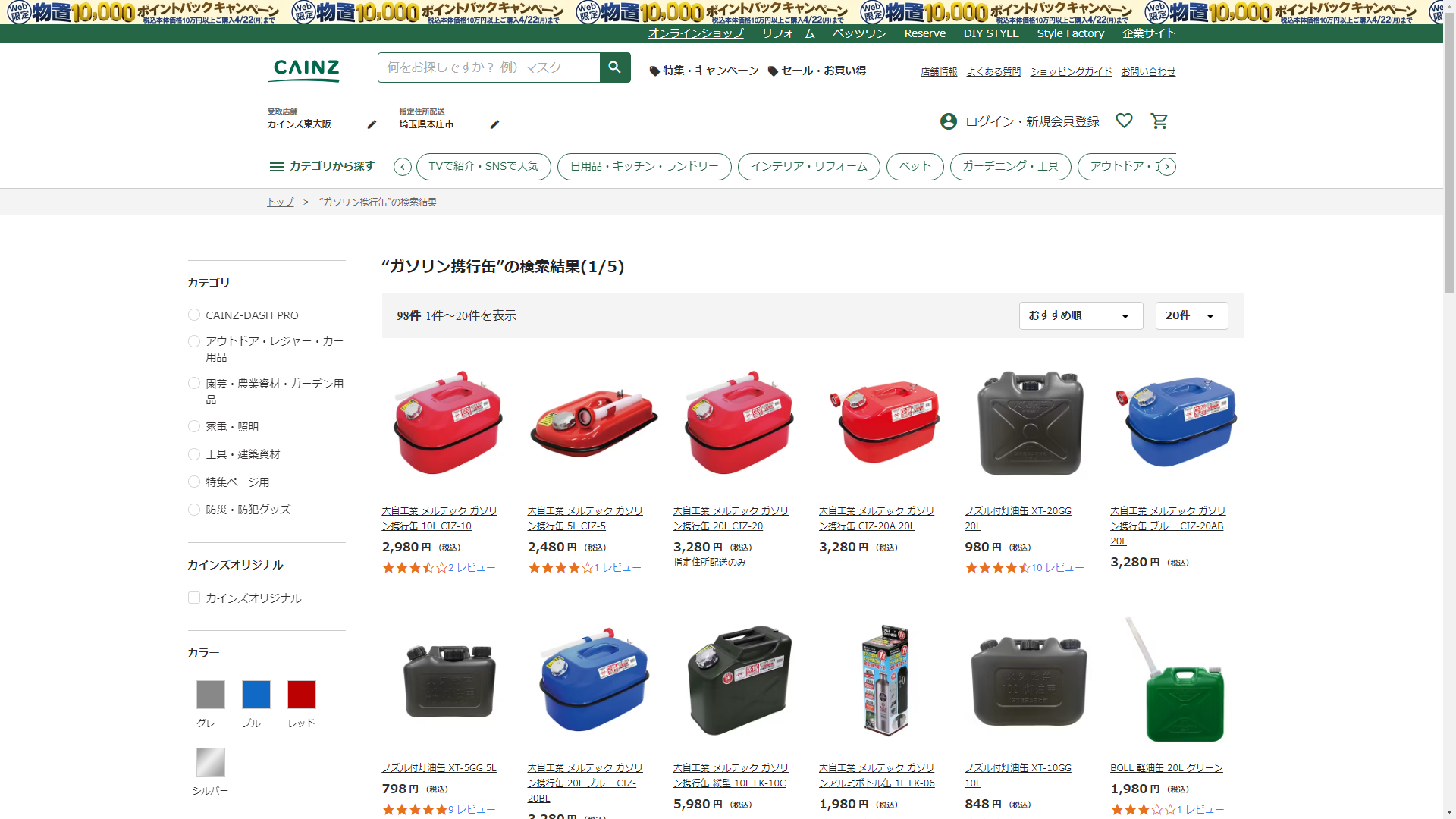 お調べしたところ現在、CAINZではガソリン携行缶の関連する商品が販売されています。