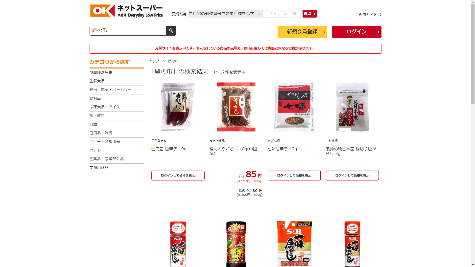お調べしたところ現在OKネットスーパーでは鷹の爪に関連する商品が販売されています。