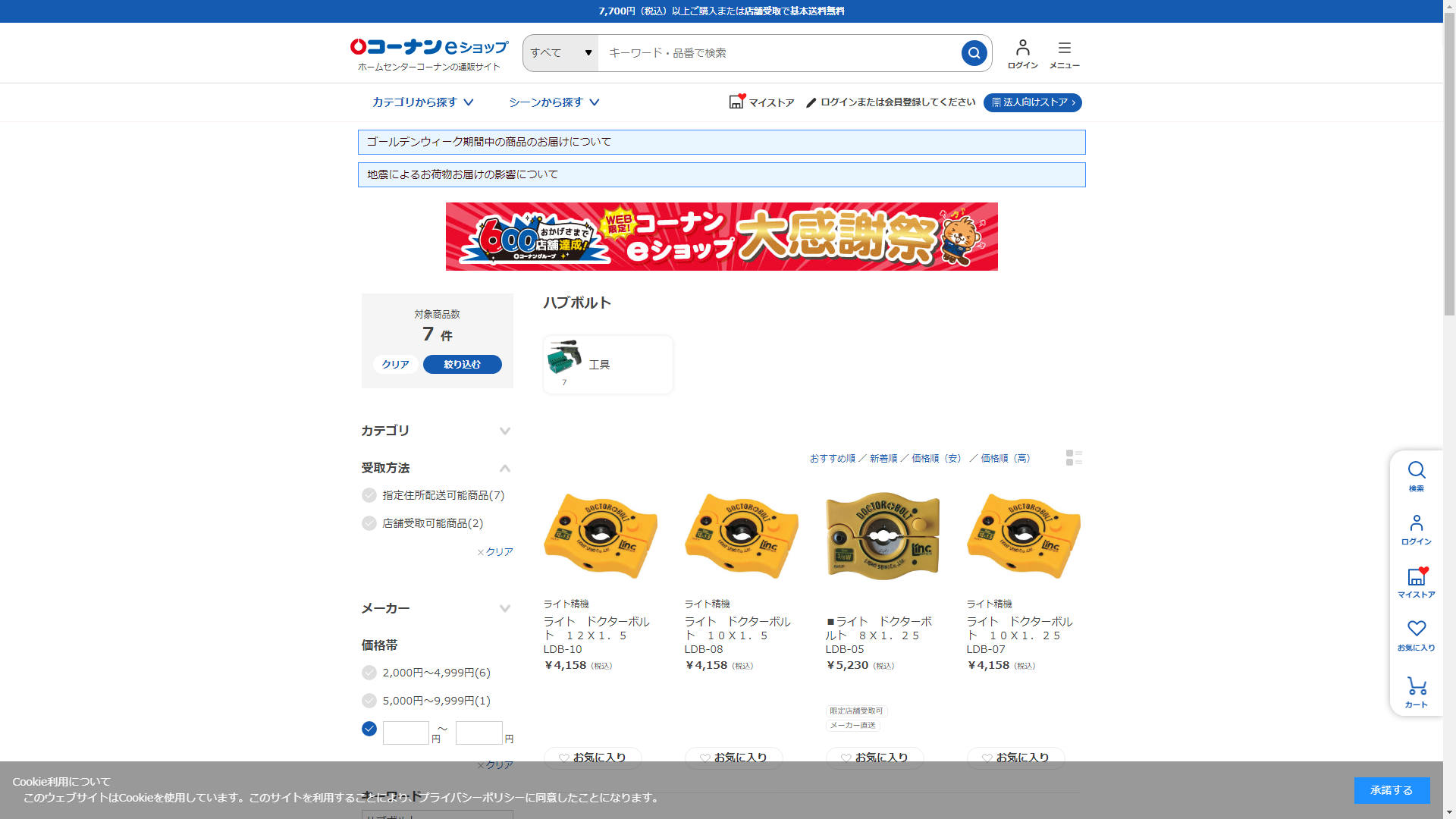 お調べしたところ現在、ホームセンターコーナンではハブボルトに関連する商品を買うことが可能です。