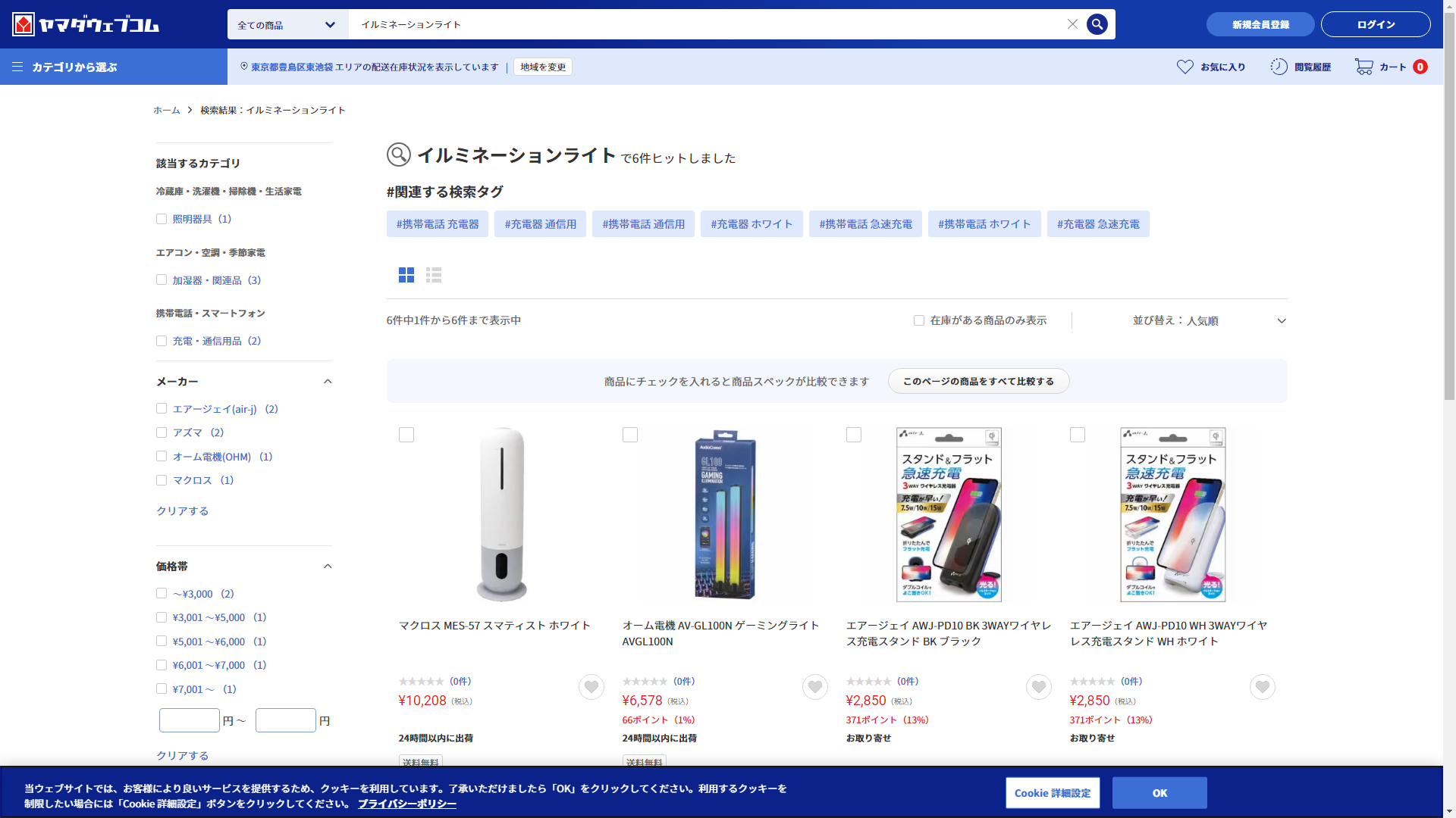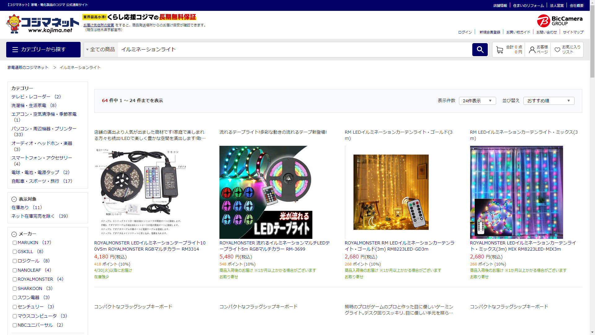 お調べしたところ現在、家電・電化製品のコジマではイルミネーションライトの関連する商品が販売されています。