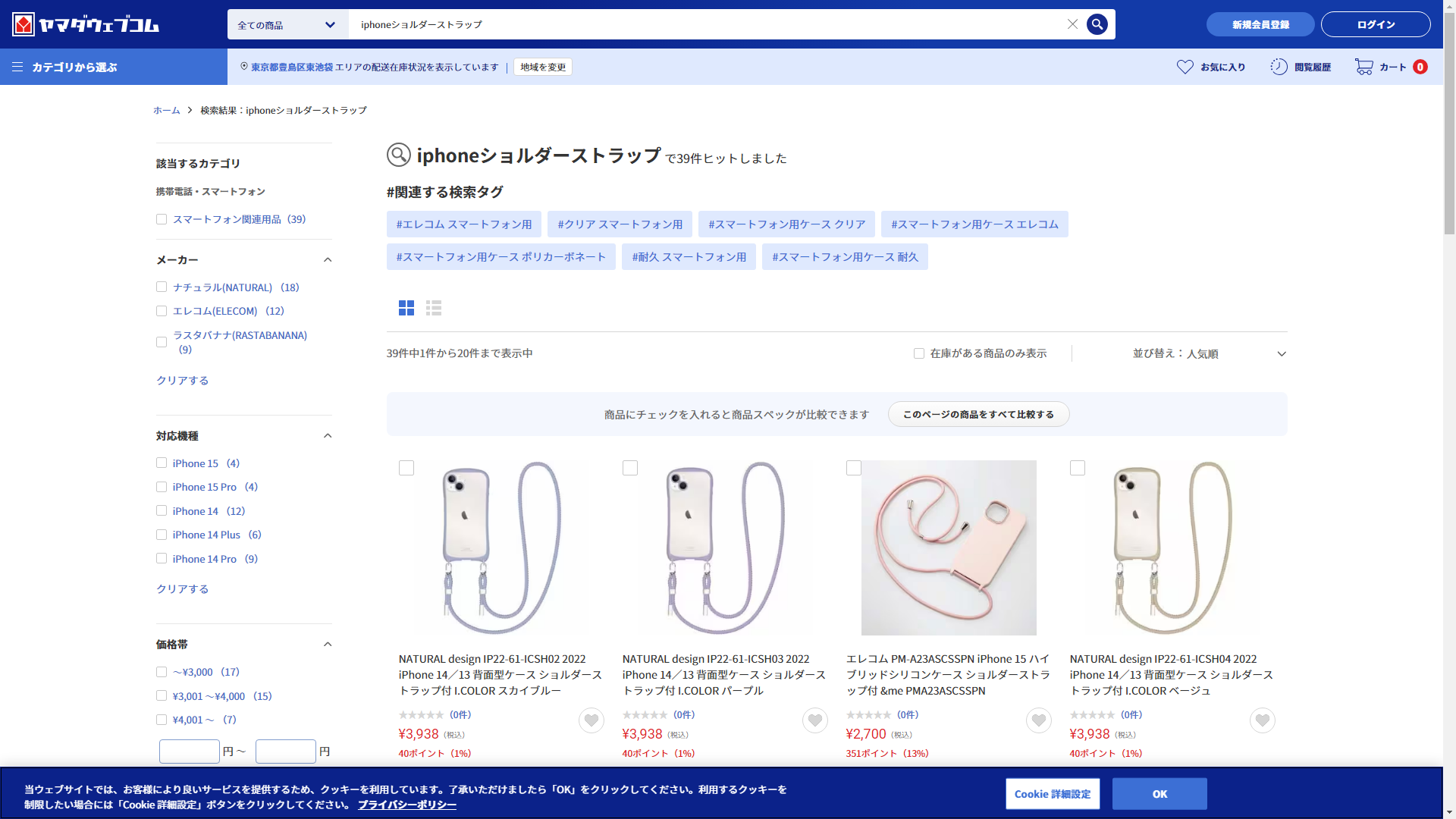 お調べしたところ現在、ヤマダデンキではiphoneショルダーストラップに関連する商品を買うことが可能です。