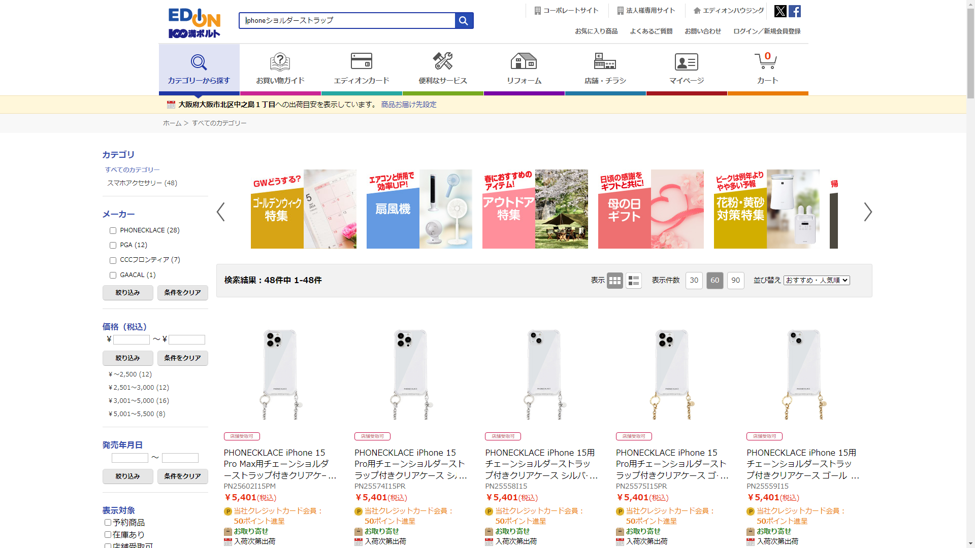 お調べしたところ現在、EDIONではiphoneショルダーストラップに関連する商品が販売されています。