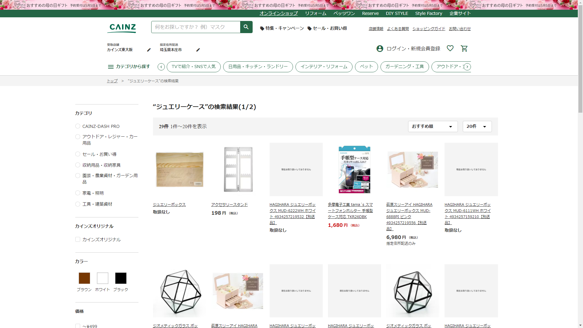 お調べしたところ現在、CAINZではジュエリーケースの関連する商品が販売されています。